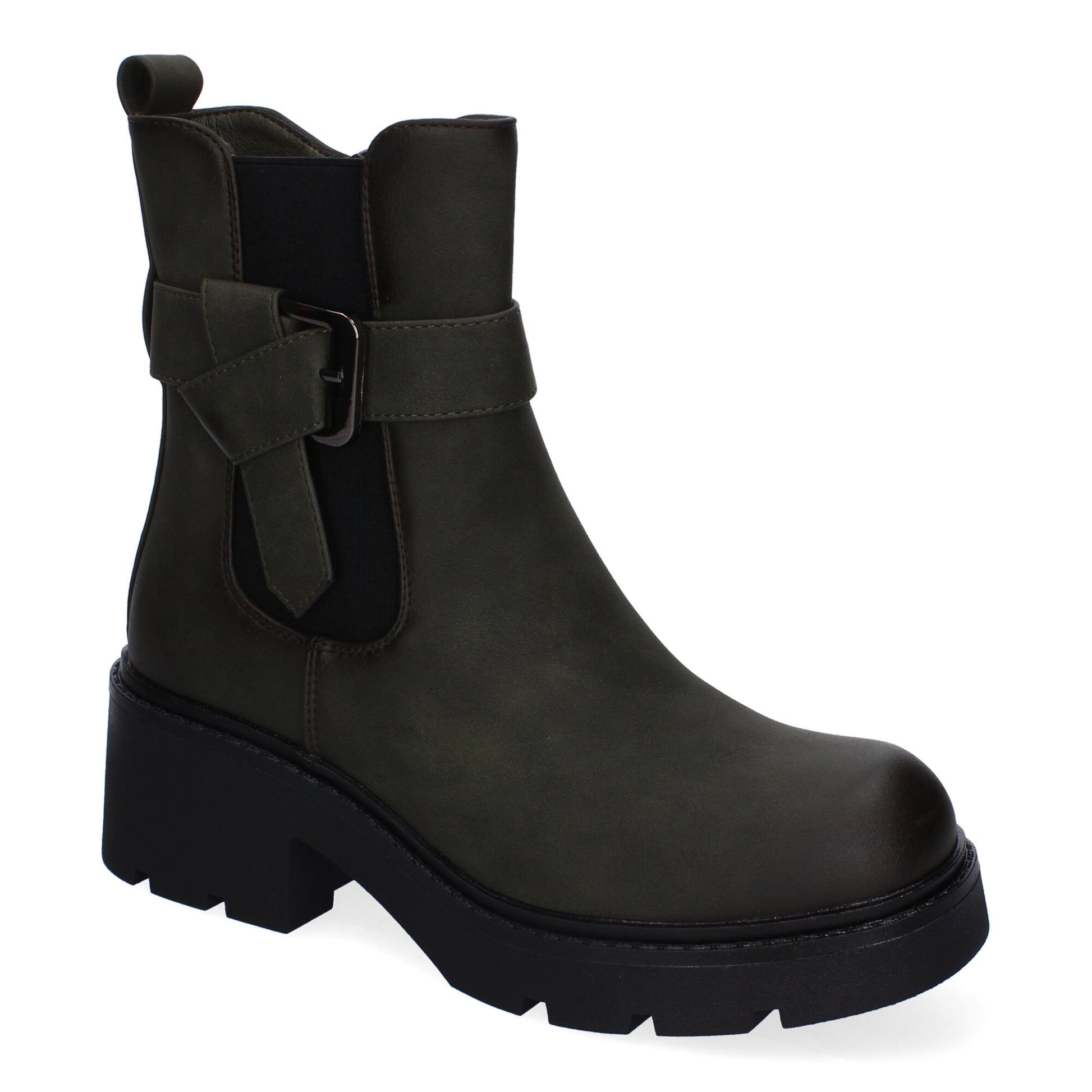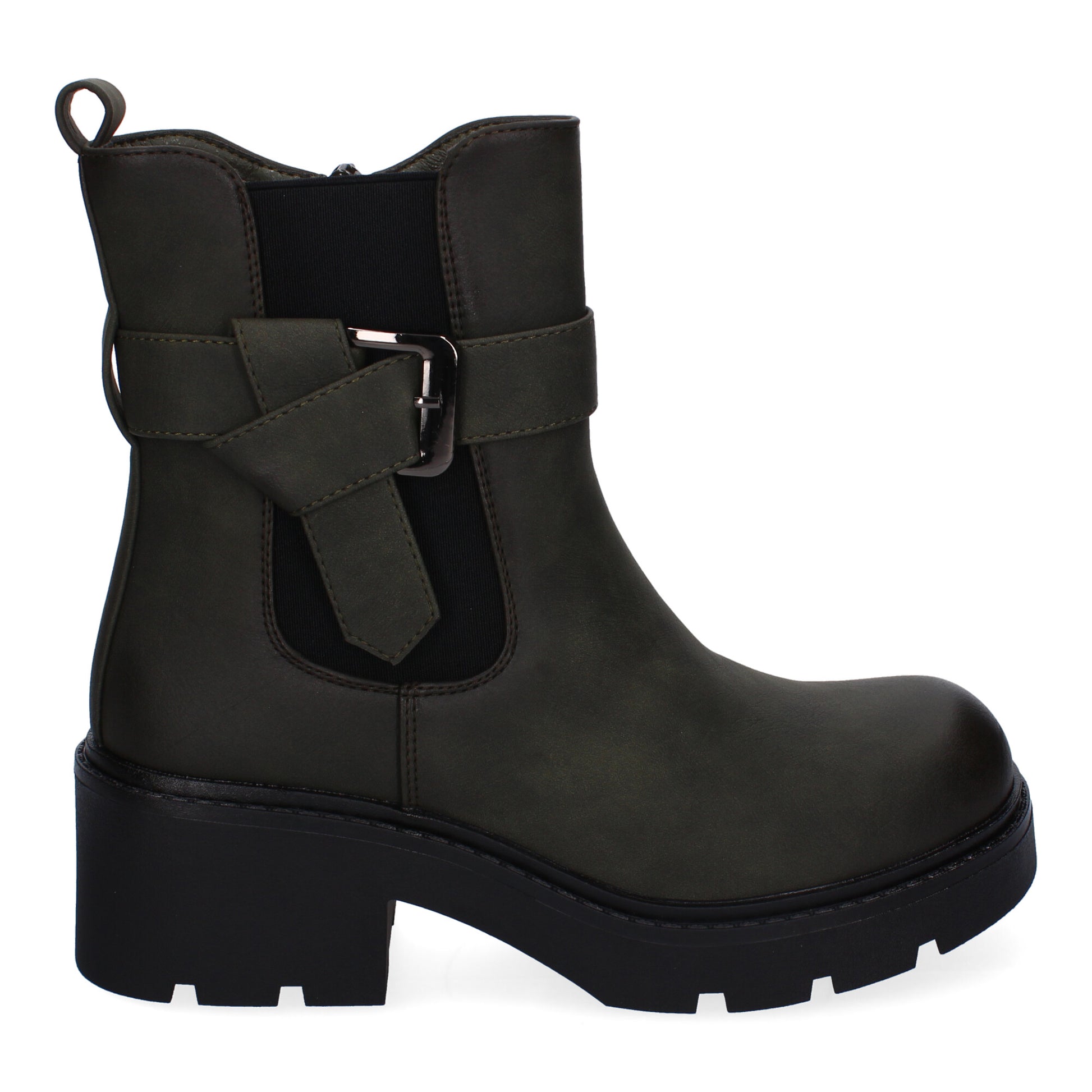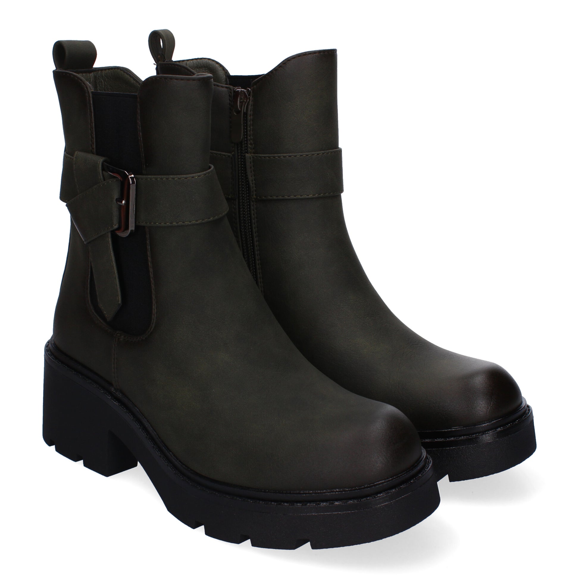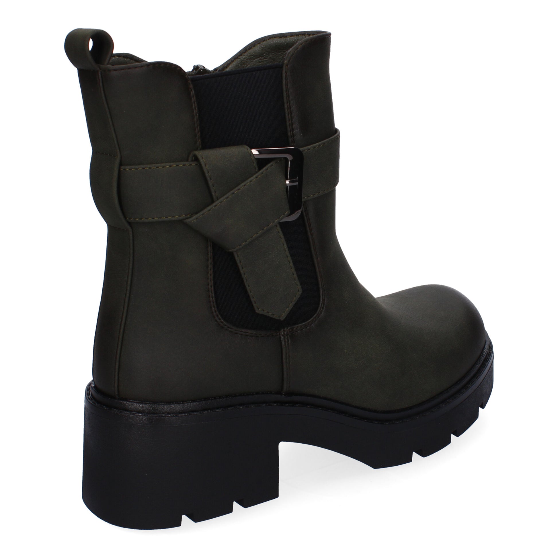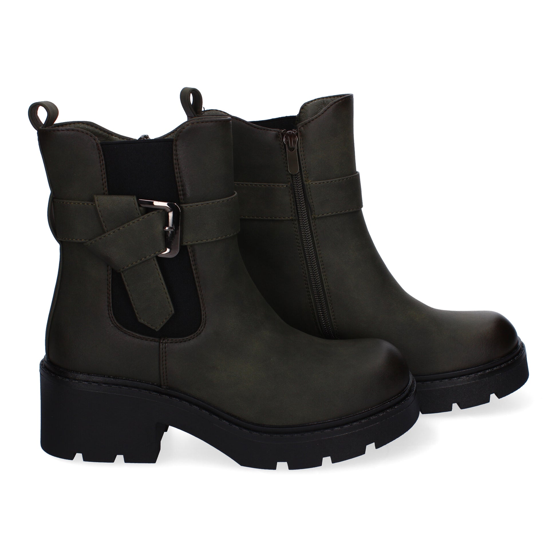 Botines de Tacón para Mujer Comodos y Elegantes Material Elástico Detalle de Hebilla con Suela Dentada Punta Redonda Cremallera Lateral Ideales para Otoño-Invierno.