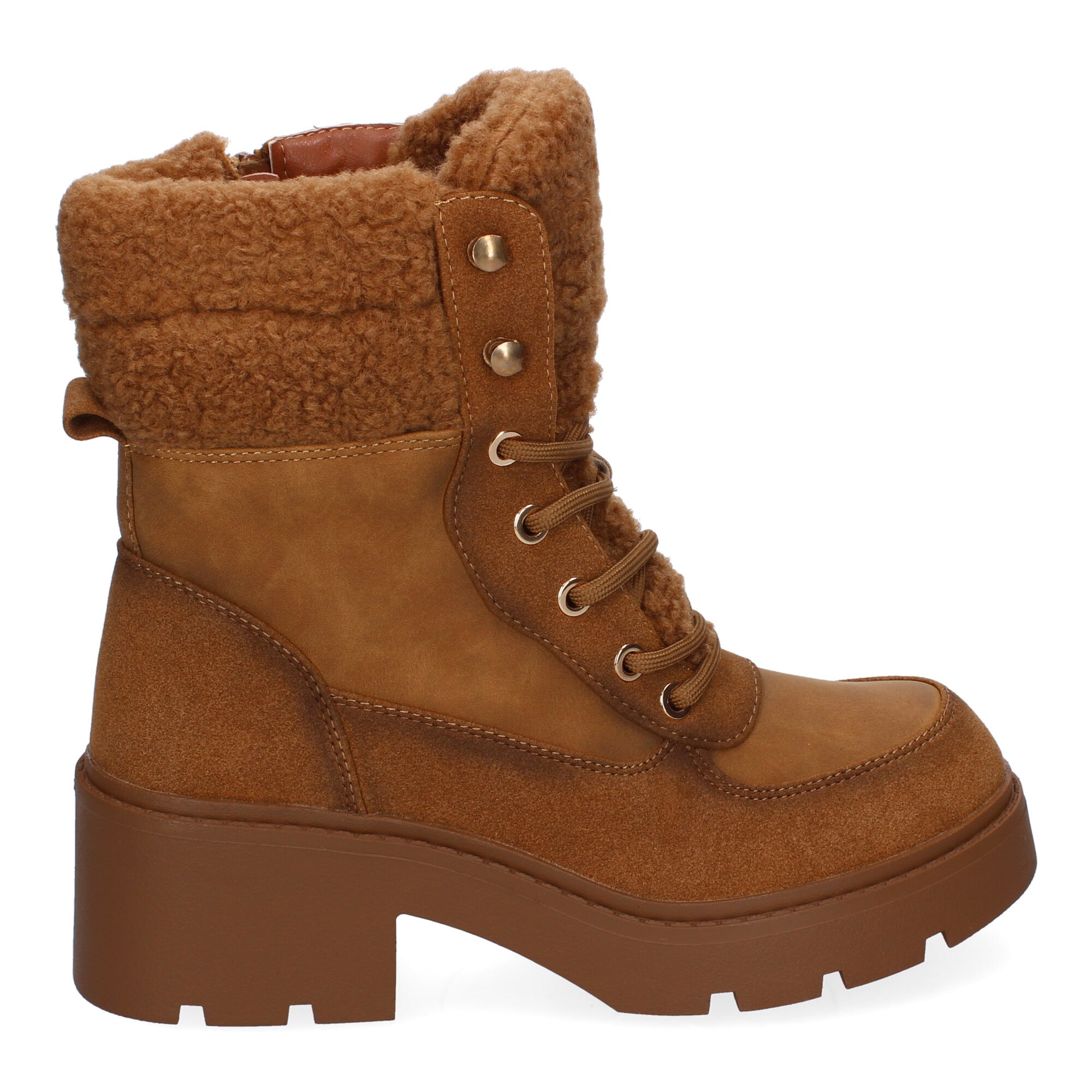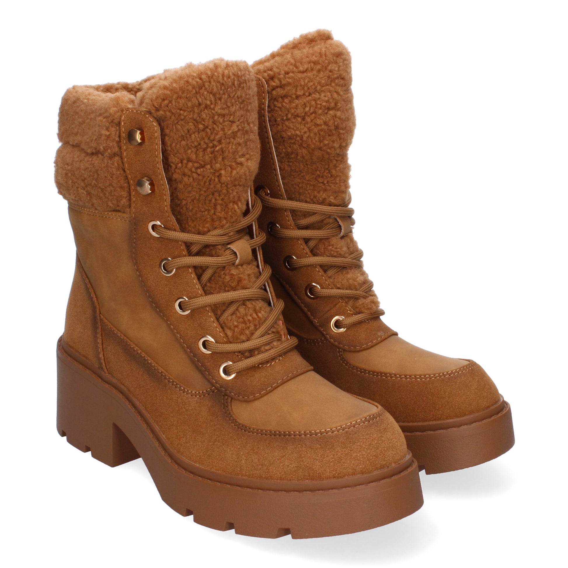 Botines de Tacón para Mujer Comodos y Elegantes Forrados de Borreguillo Adornos Metálicos Puntera Redonda y Cierre de Cordones para un ajuste cómodo y seguro.