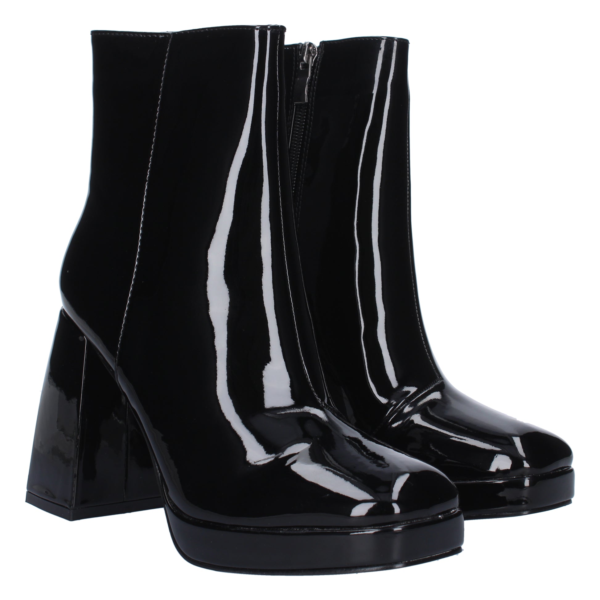 Botín de tacón para mujer con cierre de cremallera y efecto charol. Estampado liso temporad otoño invierno 2023.