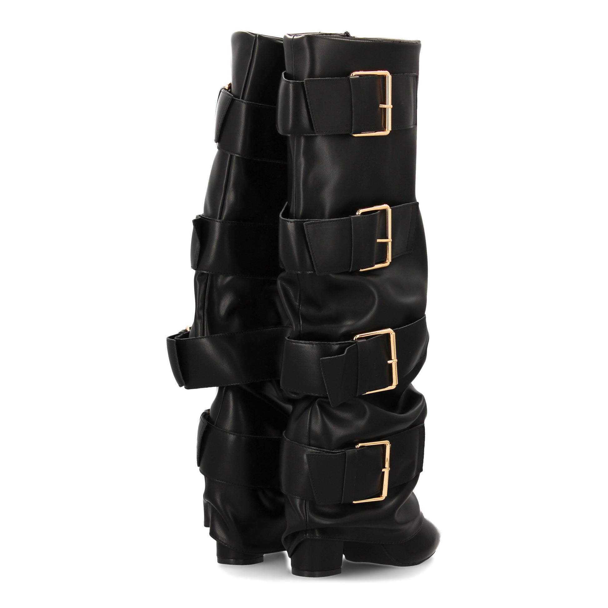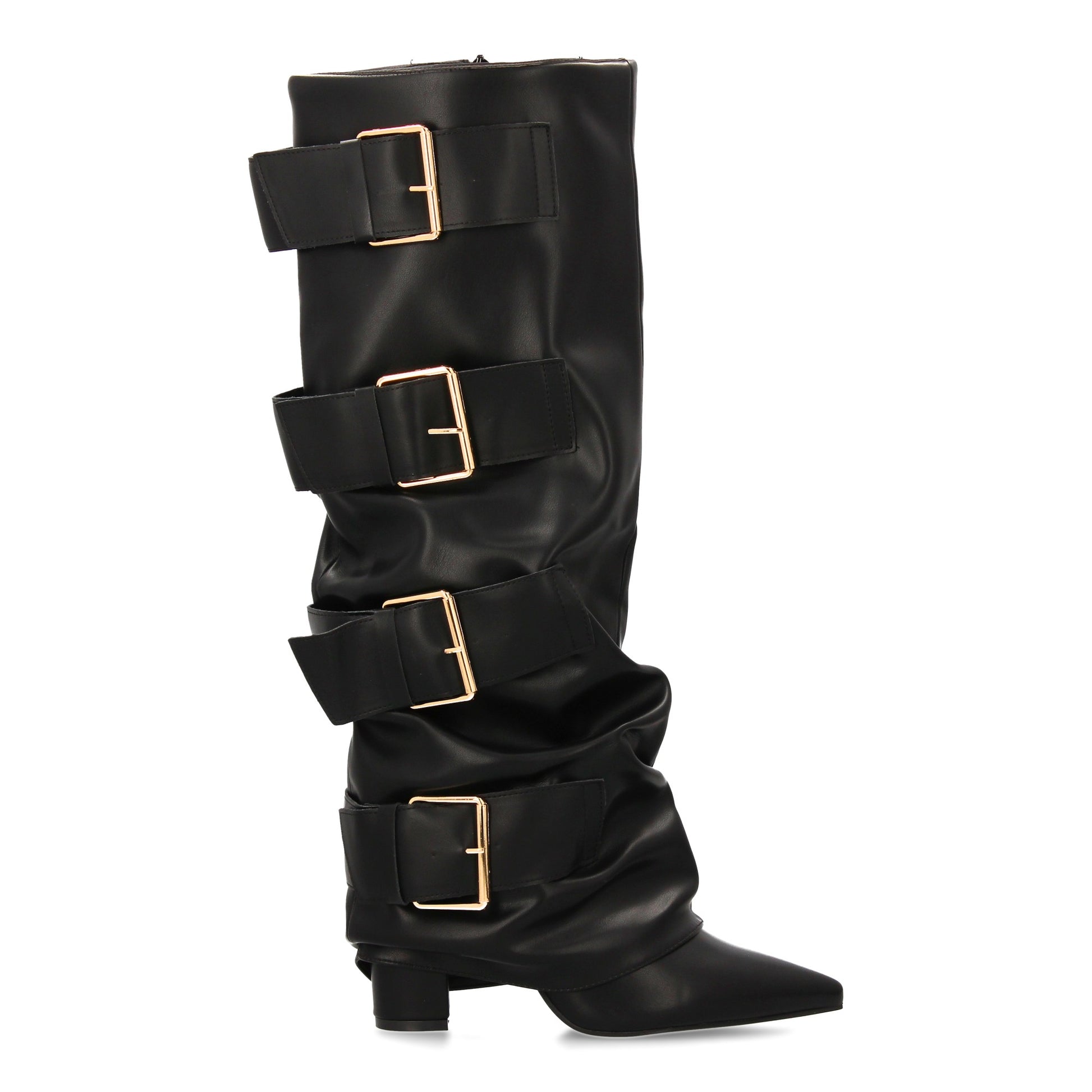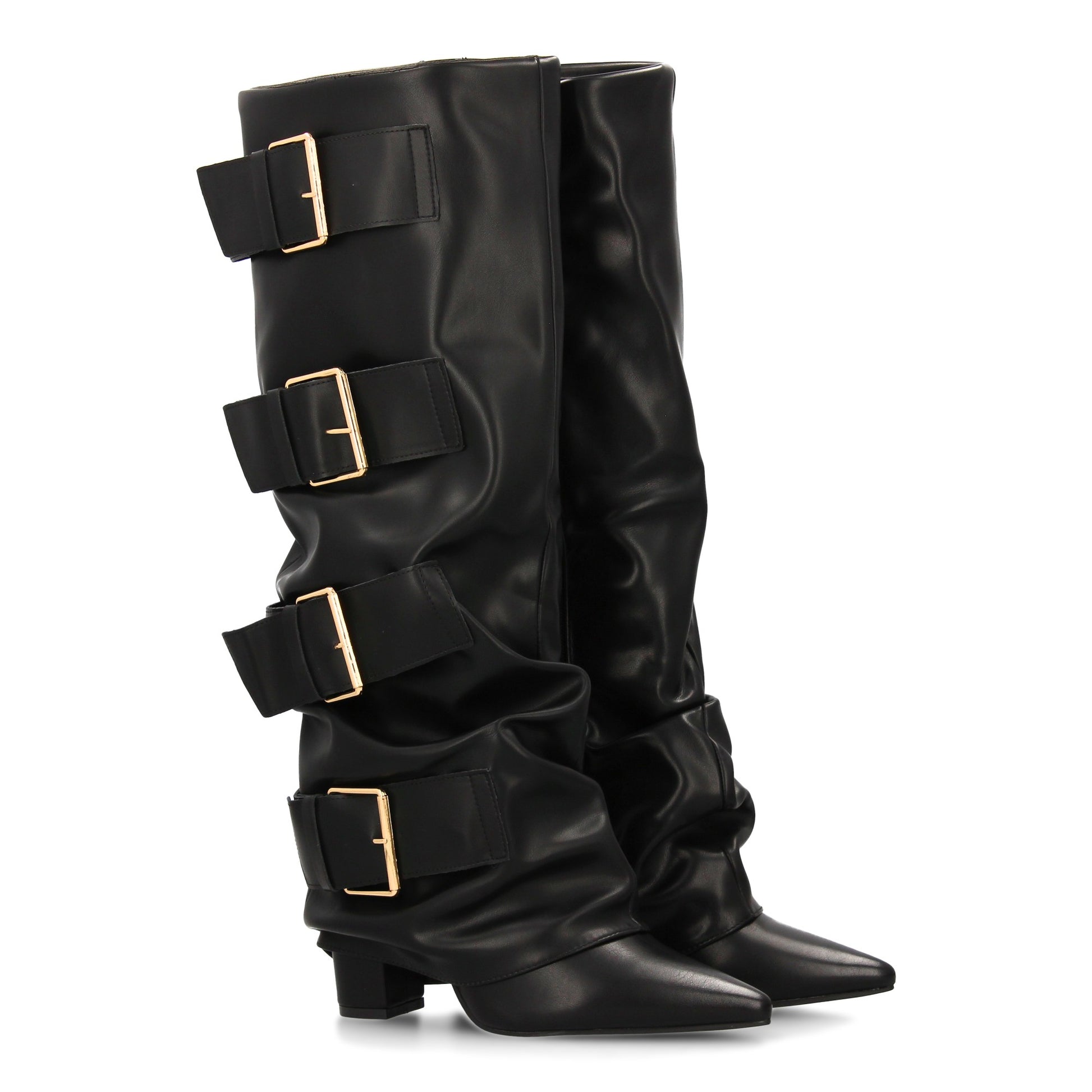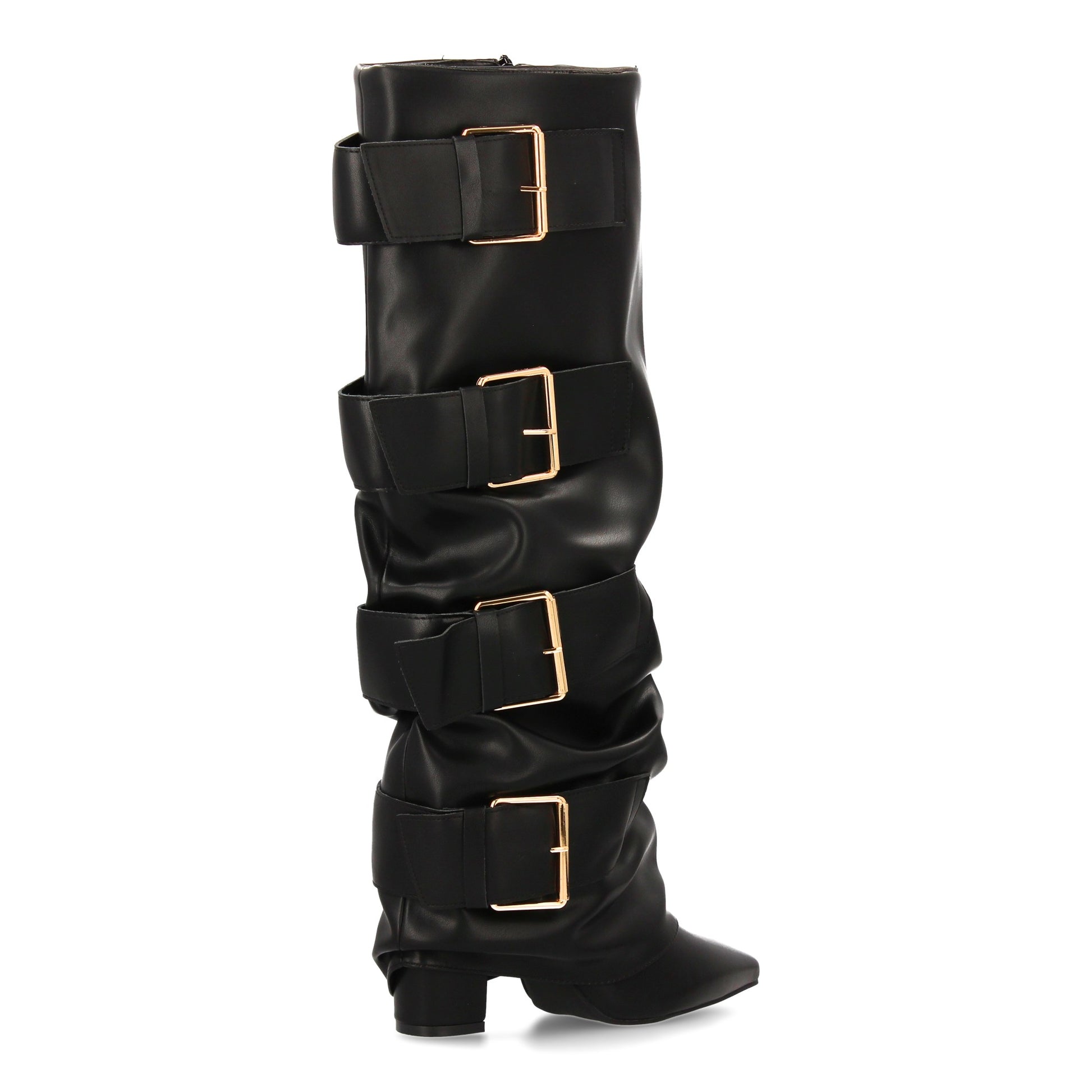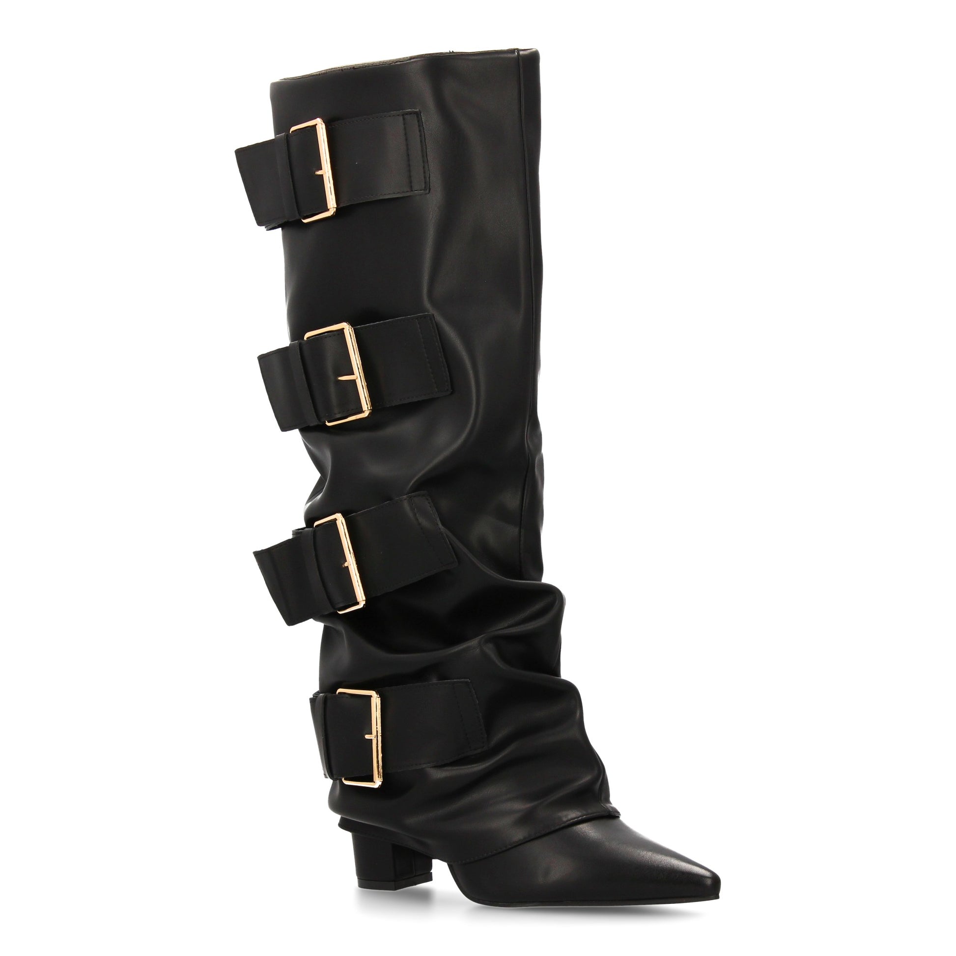 Botas altas para mujer con hebillas y efecto de forro. Punta fina y tacón comodo estilo moderno y elegante ideal para la temporada otoño invierno.