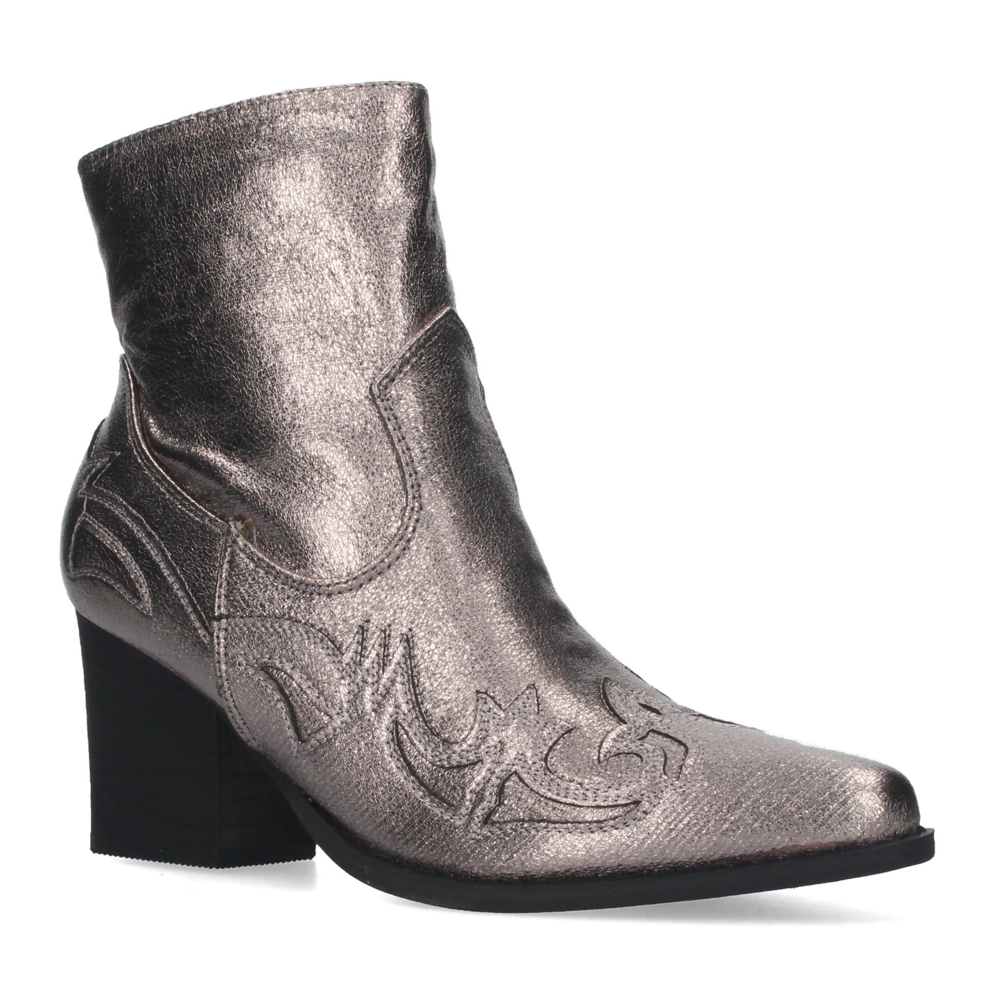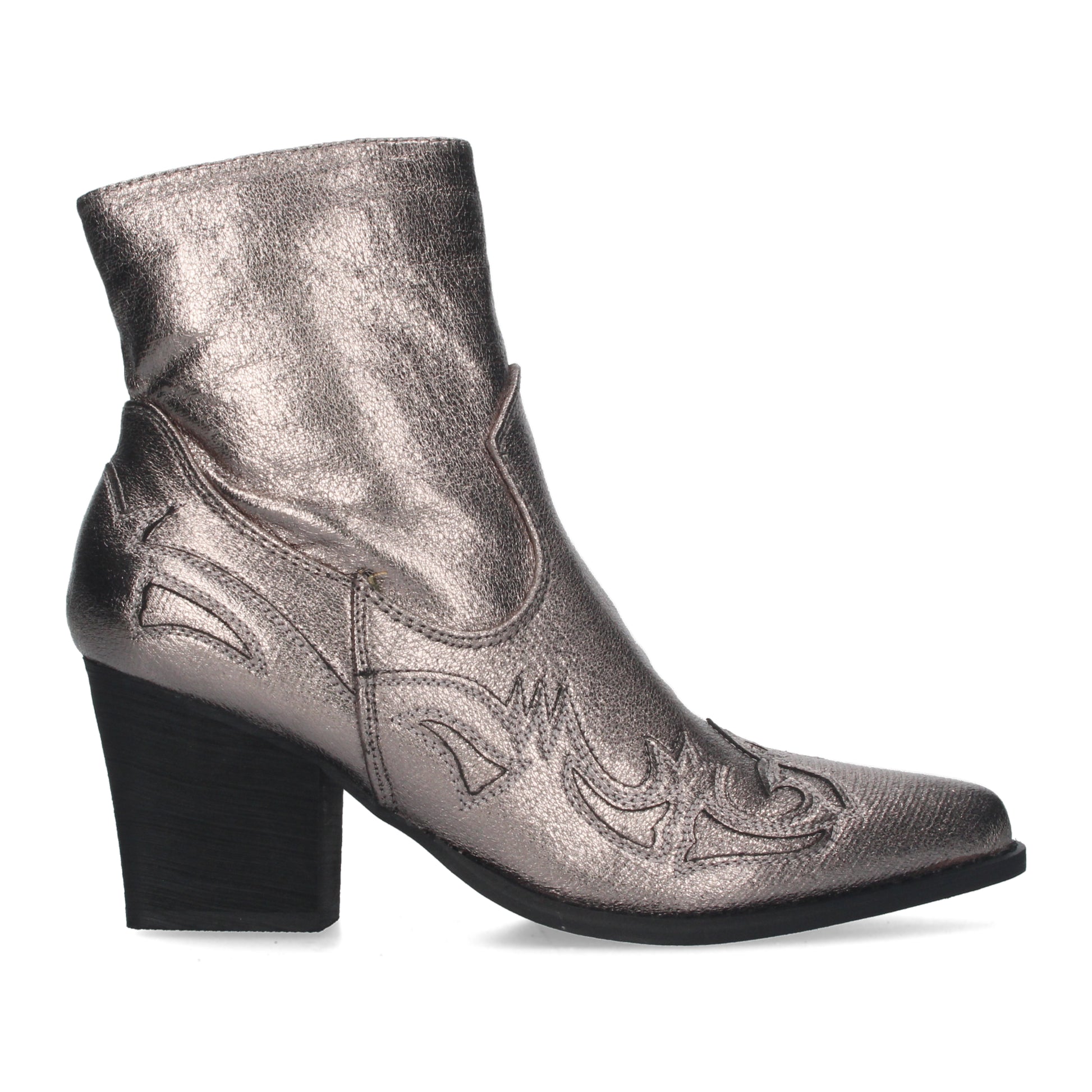 Botines camperos para mujer de tacon medio con adorno estilo cowboy en la puntera y en el talon y cierre de cremallera.