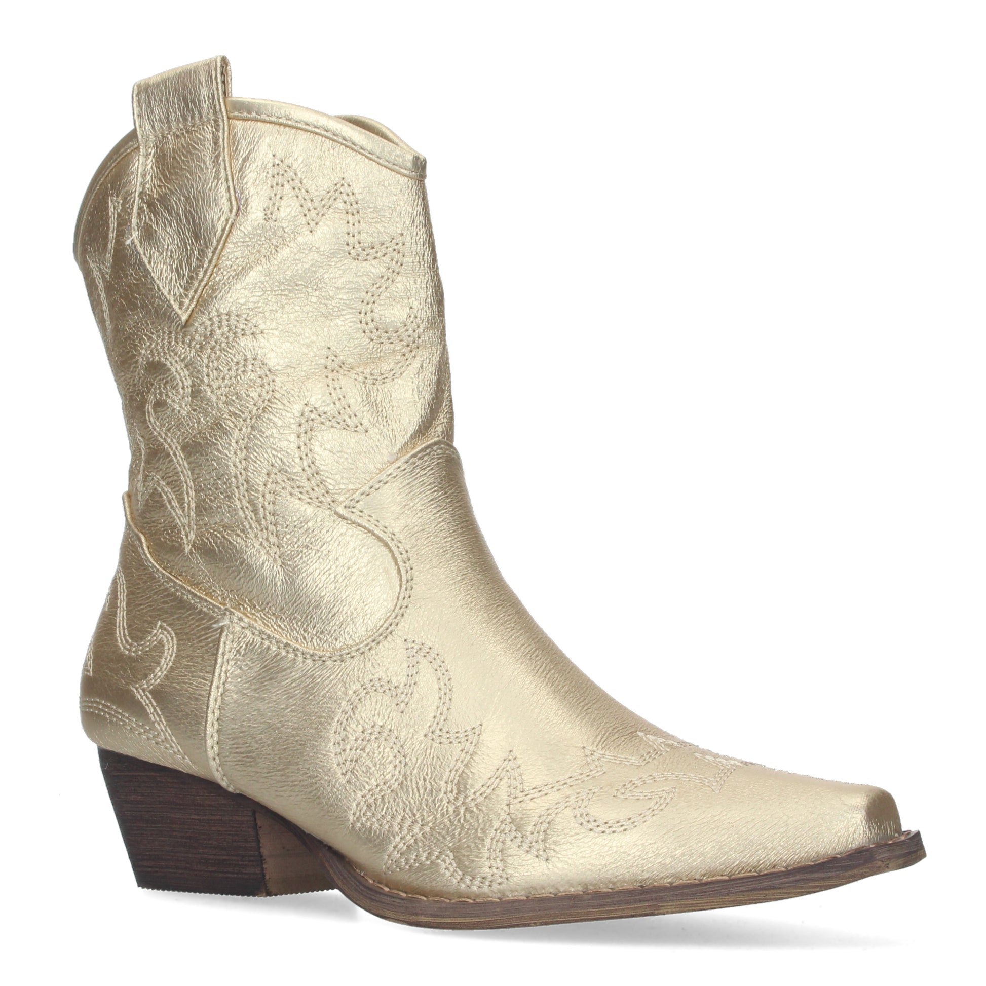 Botín de tacón bajo cómodo para mujer con bordado en caña y pala y cierre de cremallera.