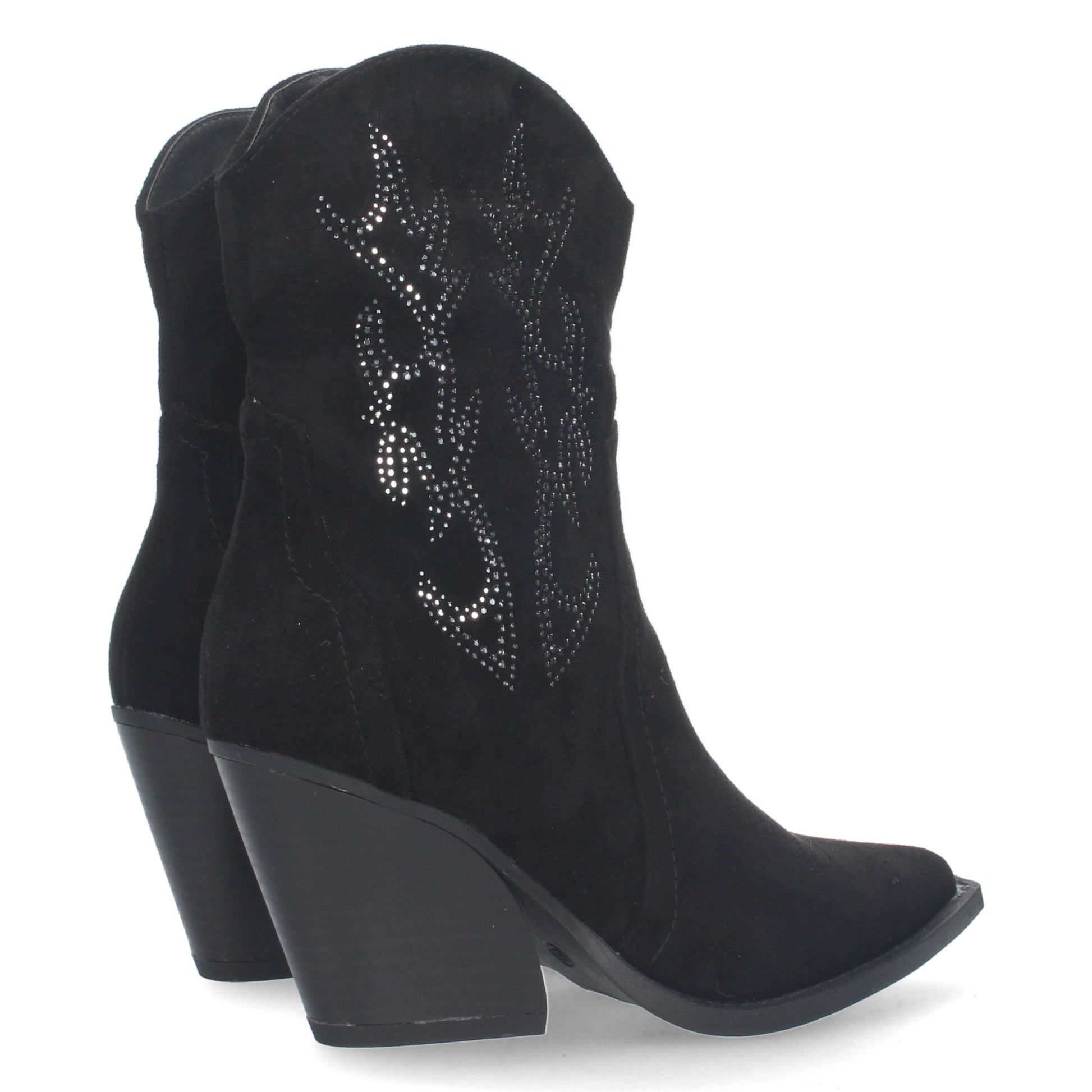 Botin campero con diseño de piedras brillantes en la caña y bordado en el empeine estilo vaquero modernizado y cierre de cremallera. La caña mide 17'5cm.