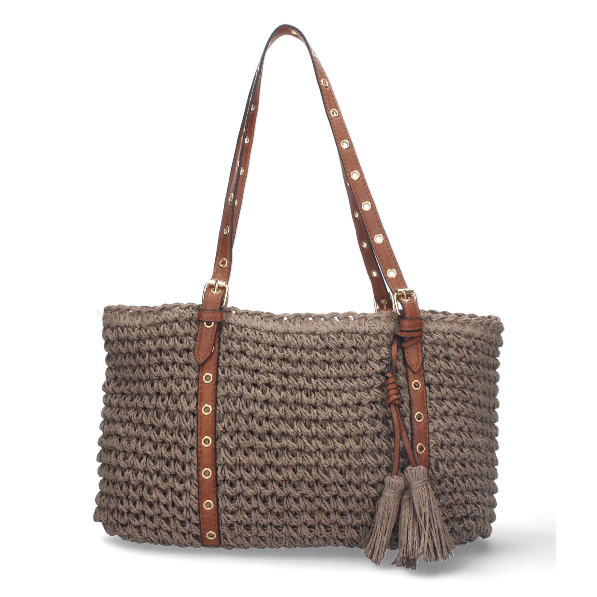 Bolso de Hombro Amplio para Mujer con Material de Rafia Flecos Remaches 1 Bolsillo Interior y Cierre de Cremallera