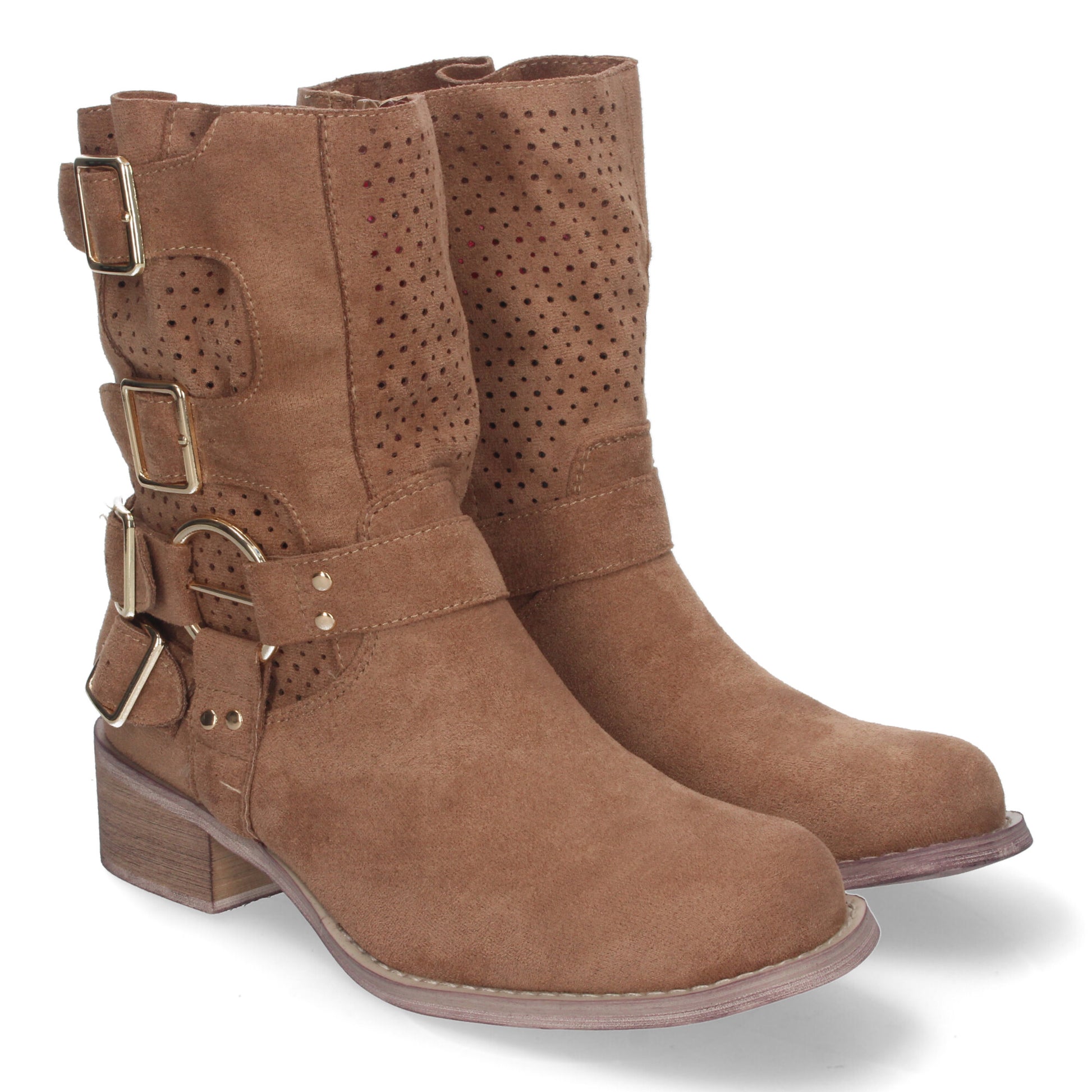 Botines de Mujer con Tacón Bajo y Adornos de Hebillas Caña Calada Cremallera Lateral Punta Redonda Perfectos para Toda Ocasión