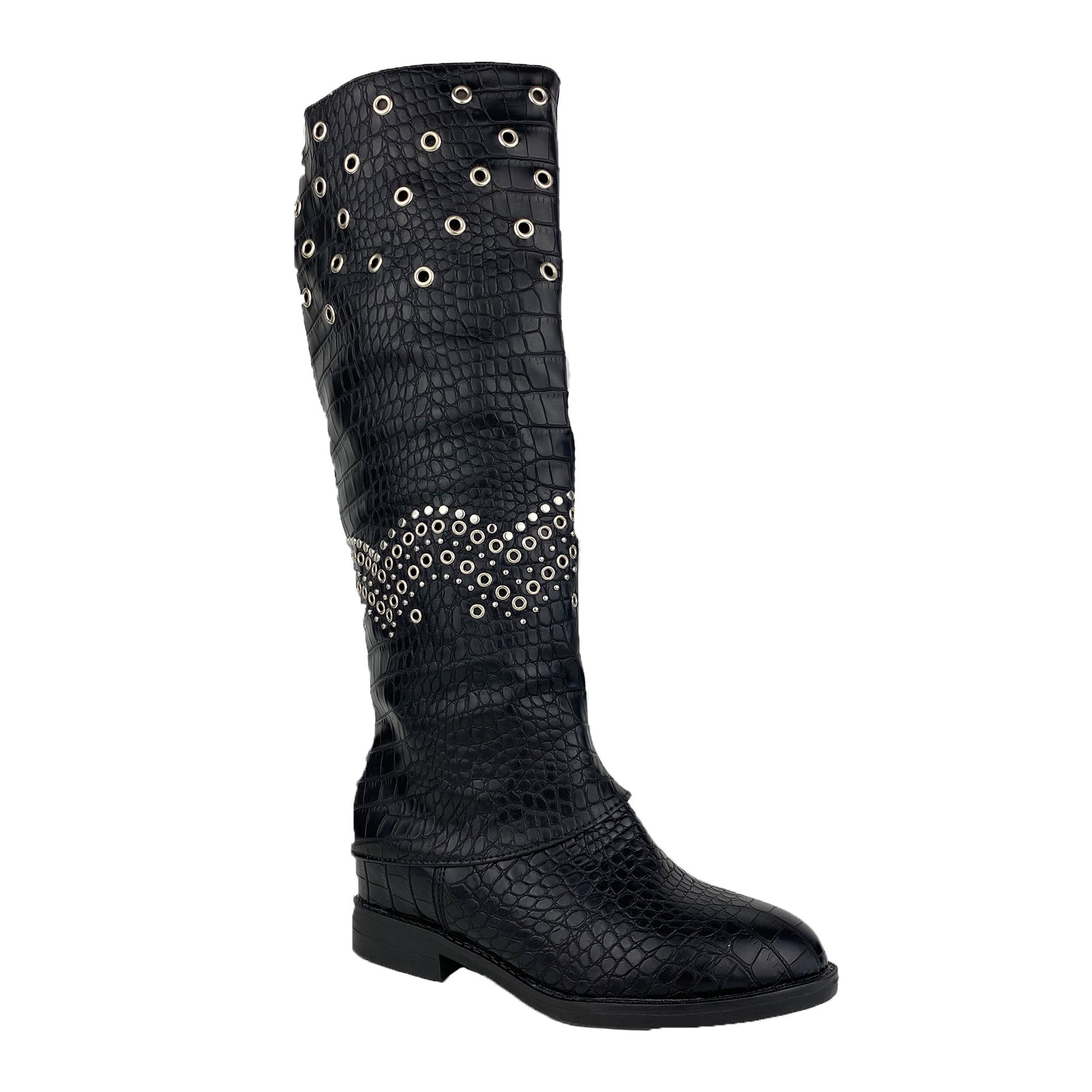 Bota de Mujer con Estampado de Cocodrilo Tachuelas en Caña y Cierre de Cremallera Otoño Invierno 2020