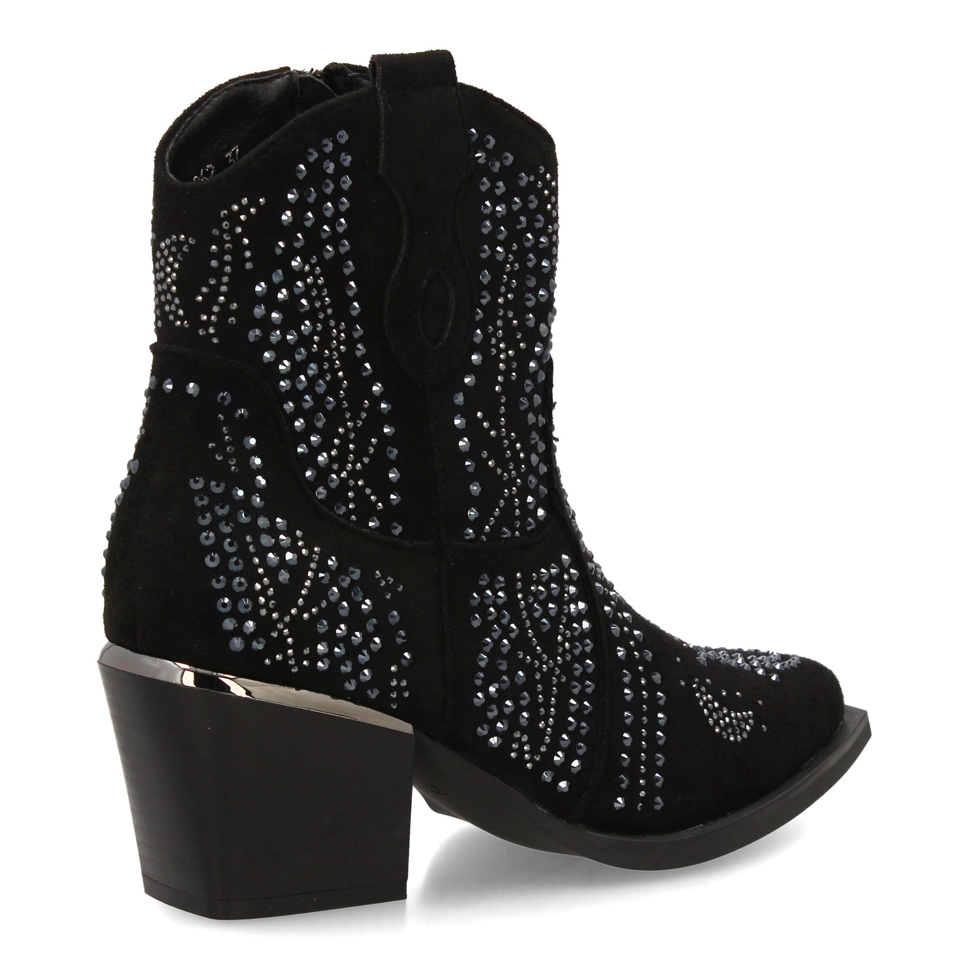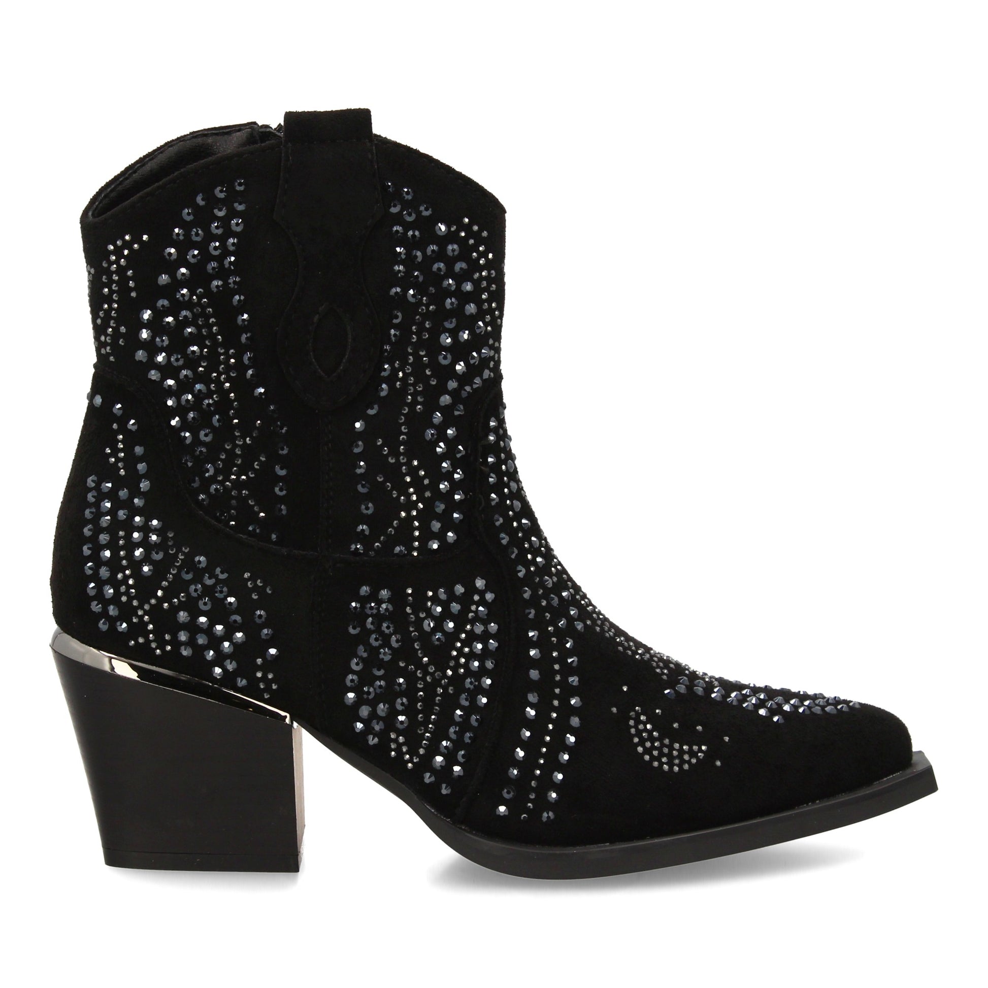 Bota de mujer con estilo vaquero detalles brillantes y cierre cómodo. Forrado de tachuelas brillantes tacón cubano. Ideal para cualquier ocasión combina con jeans faldas o vestidos.
