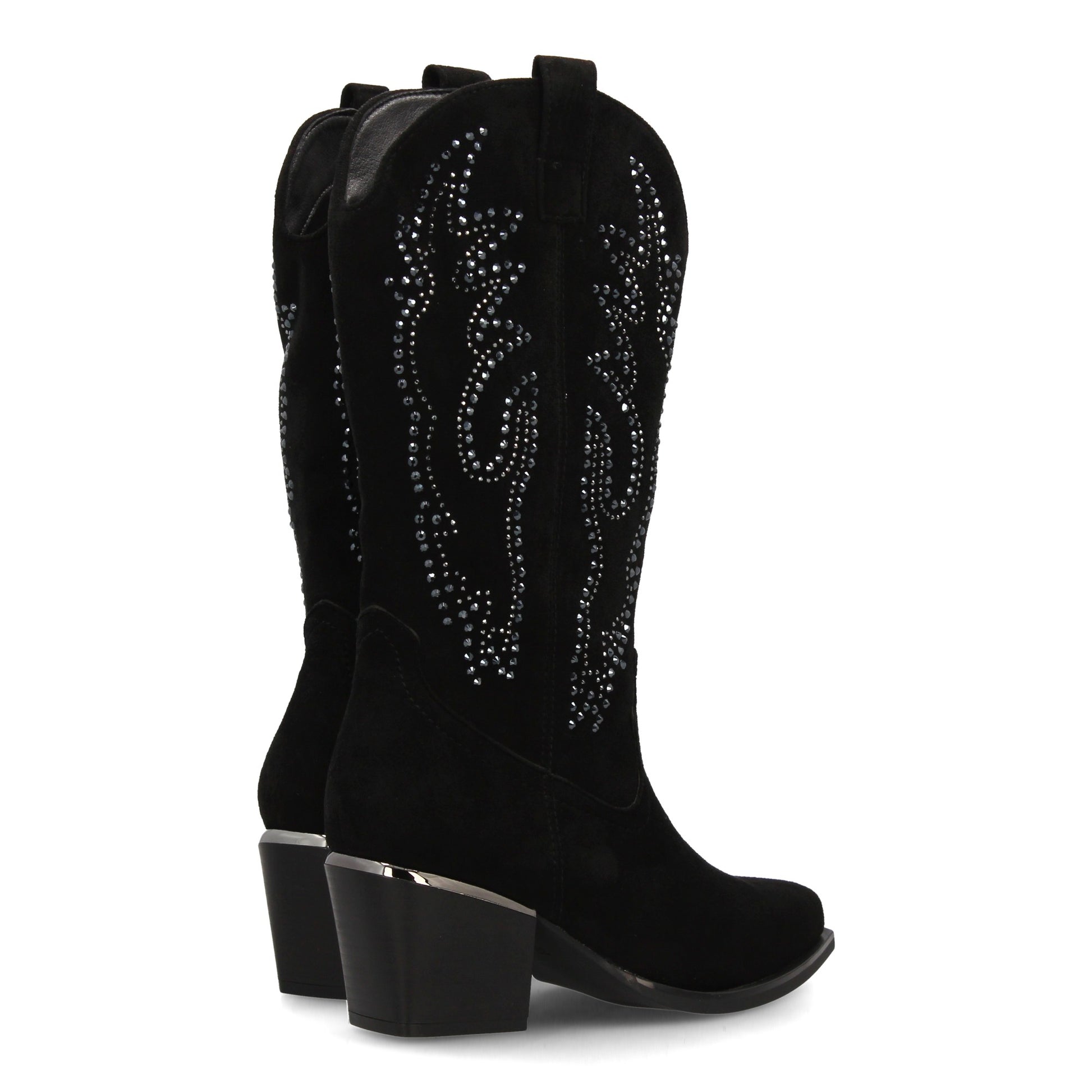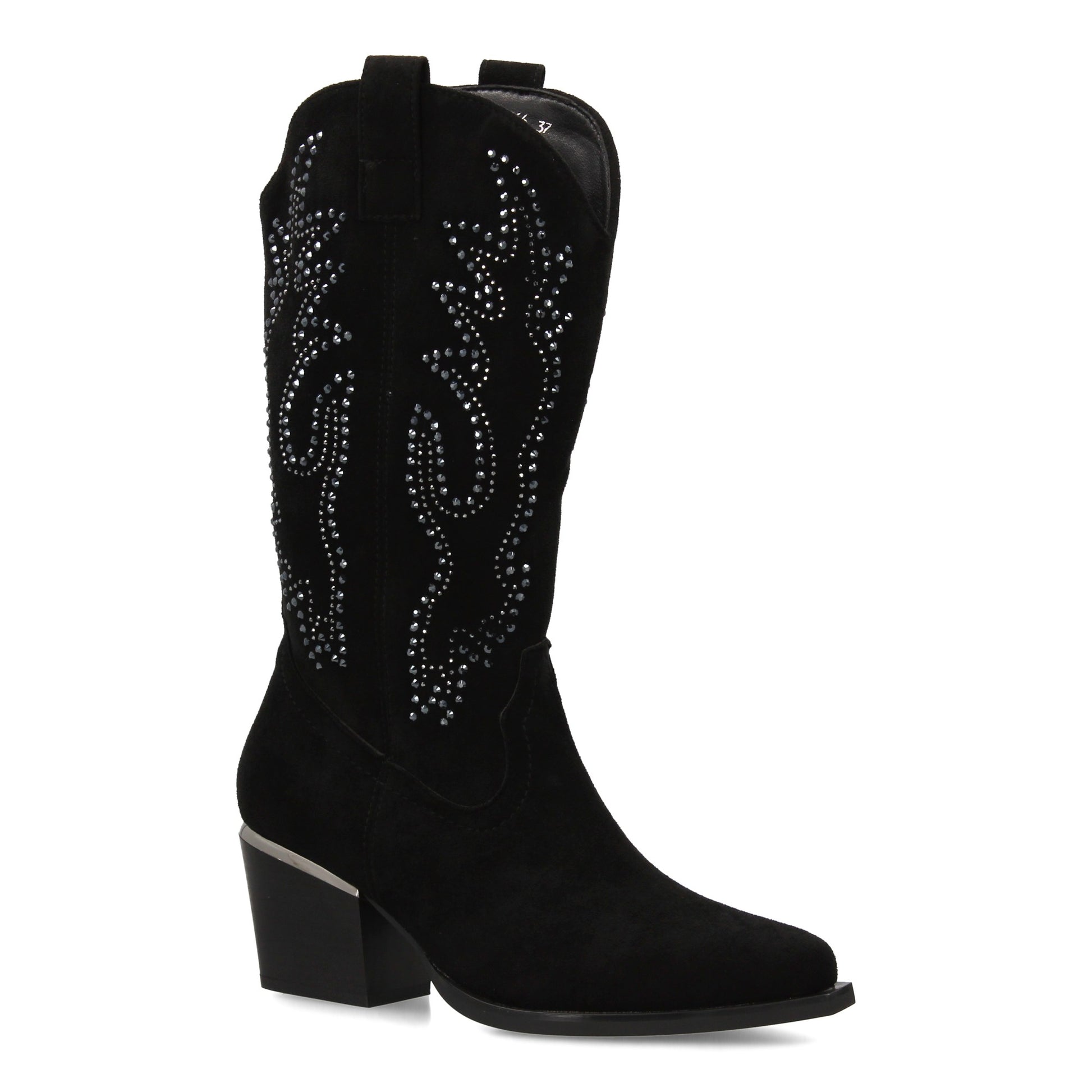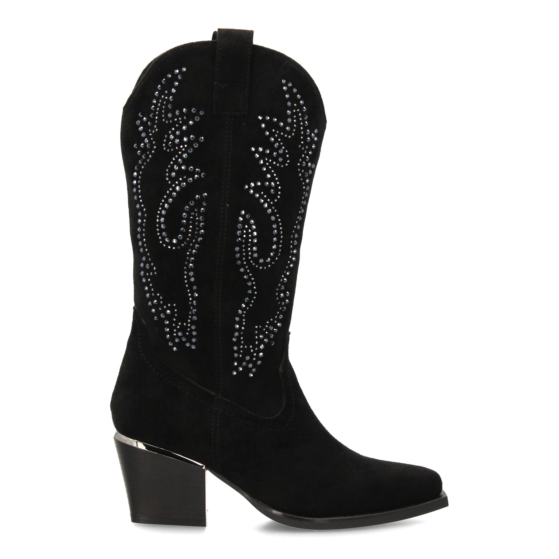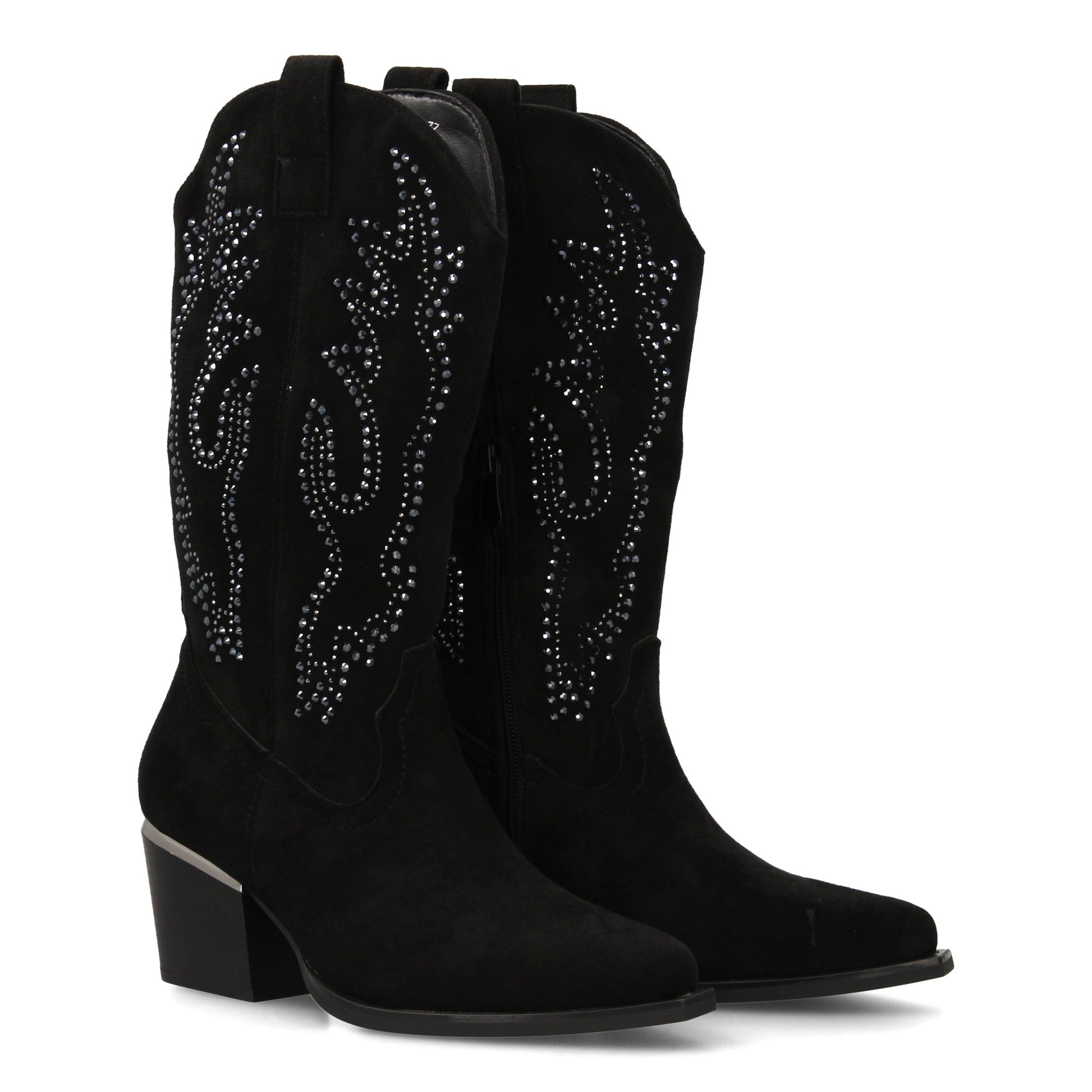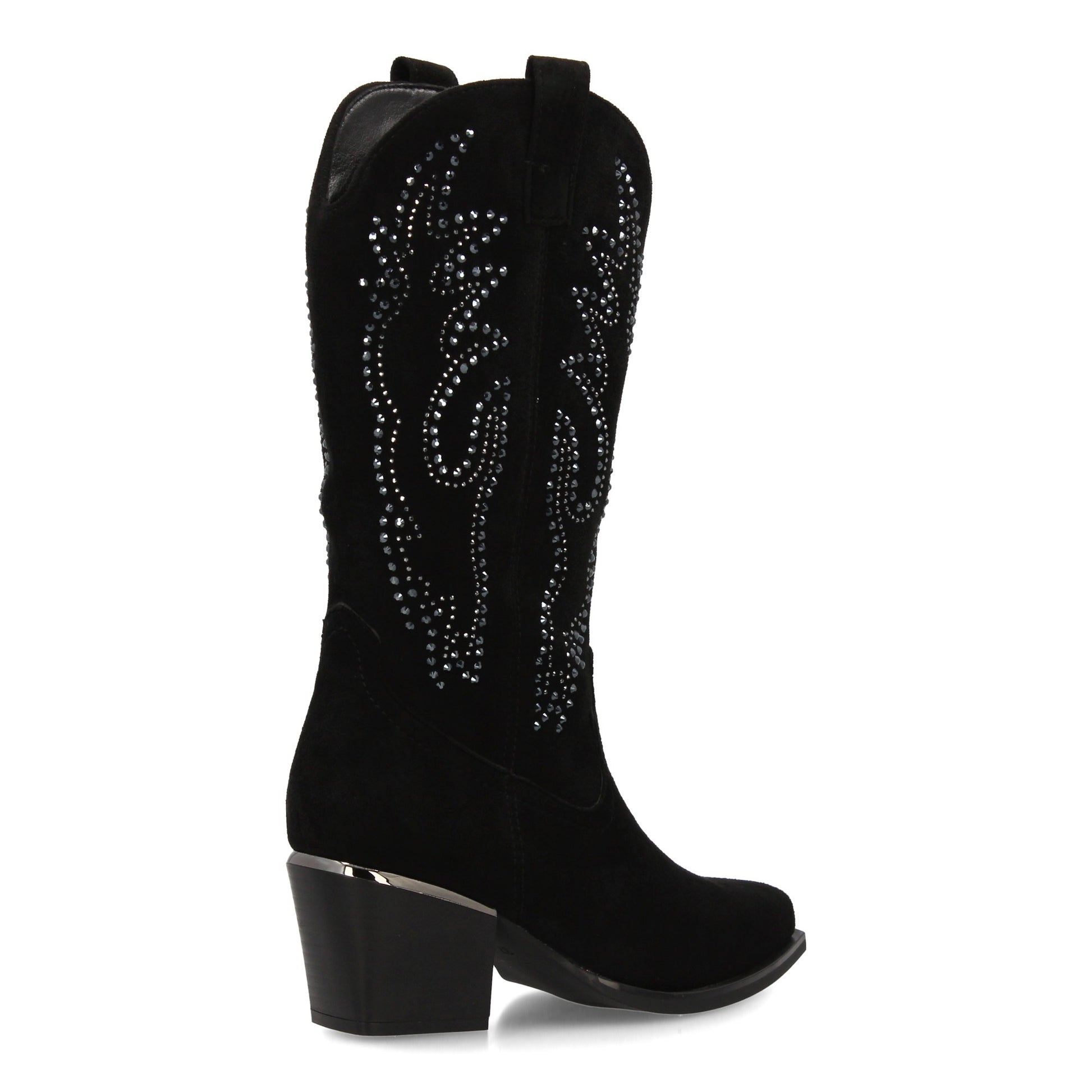Bota de Mujer con Detalles brillantes elegantes en la caña y Tacón comodo para Estilo Casual o Formal Ideal para otoño invierno cierre de cremallera lateral y adorno metálico en el tacon.