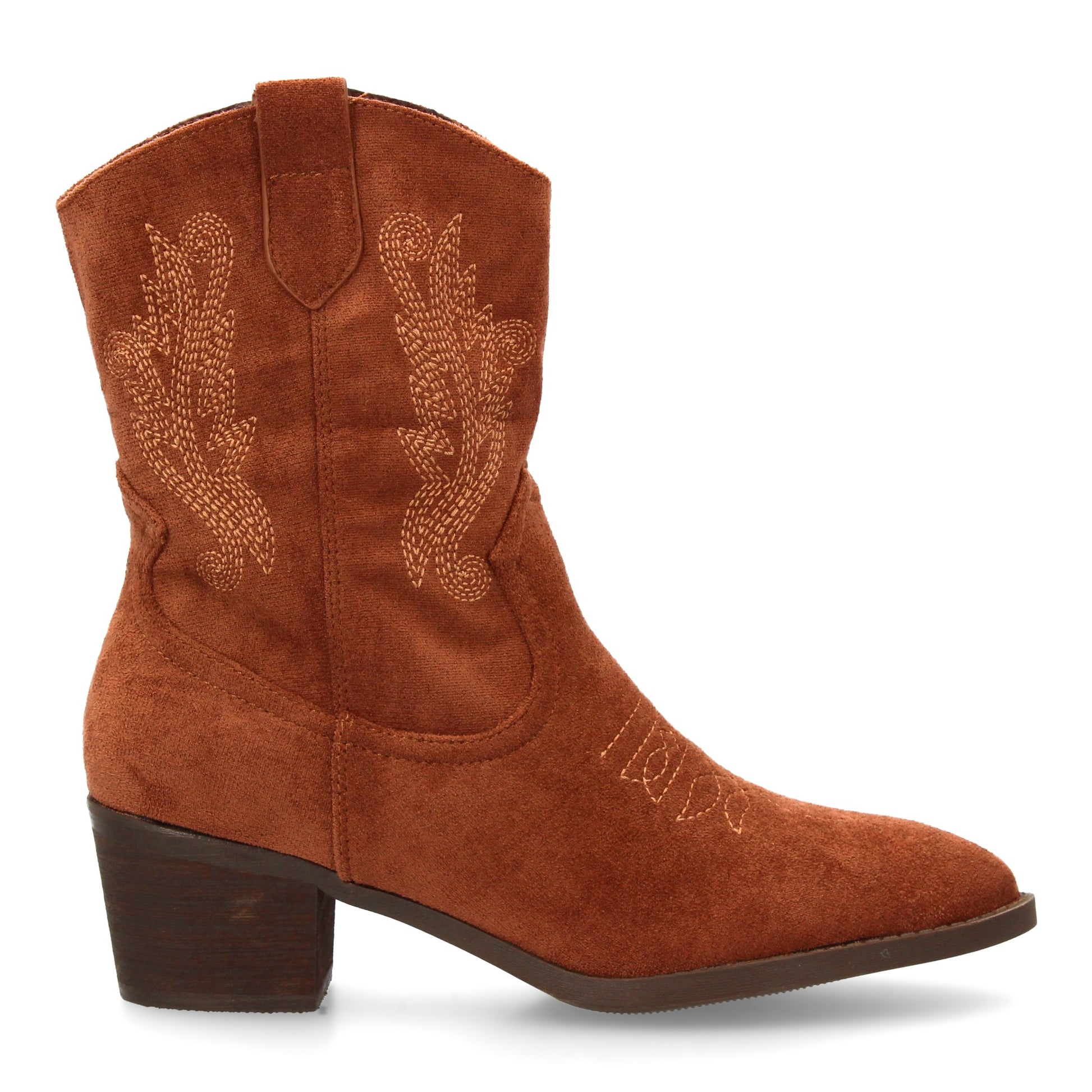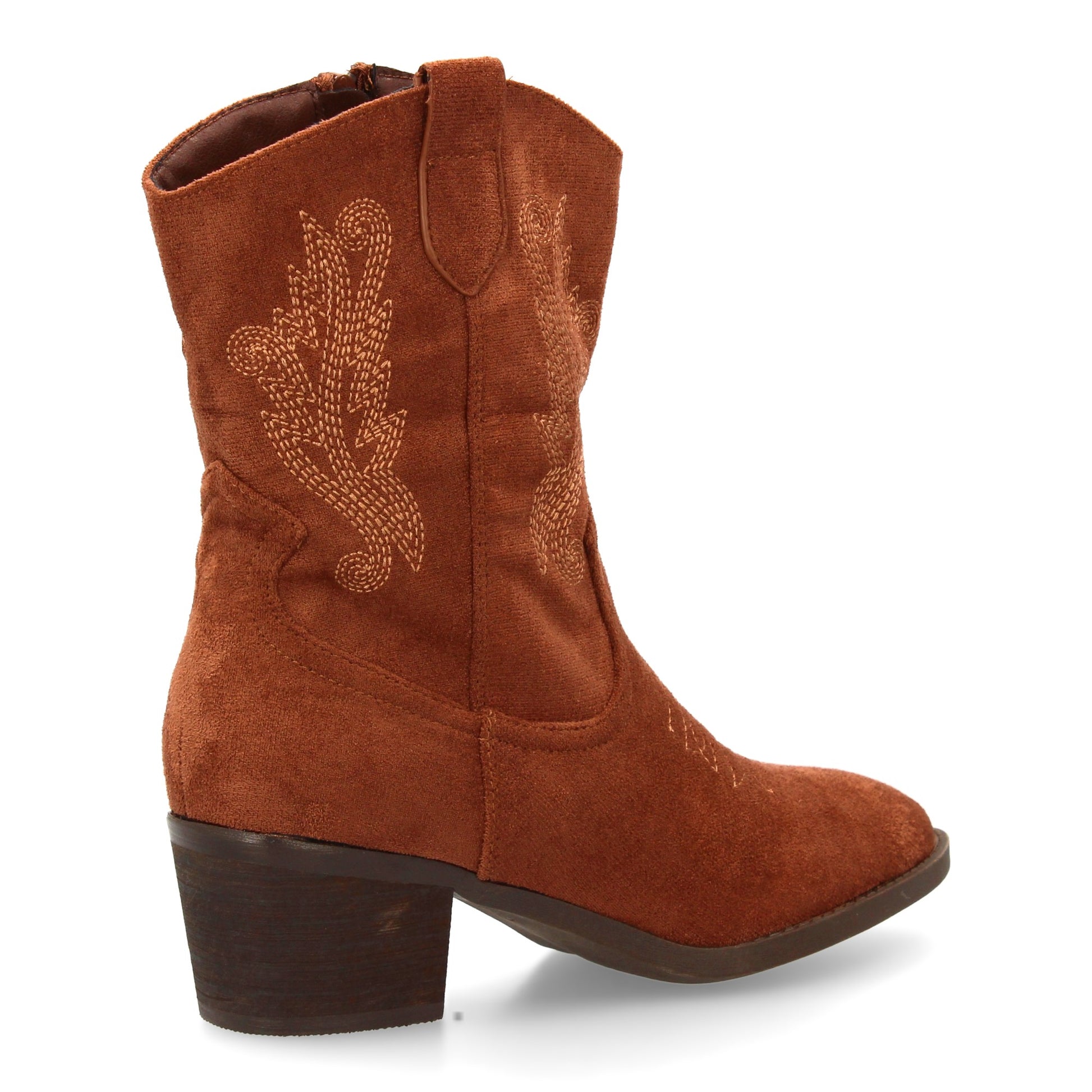 Bota cowboy de caña media con bordados laterales y punta fina. Tacón ancho comodo ideal para mujer en temporada Otoño invierno. Cierre de cremallera.