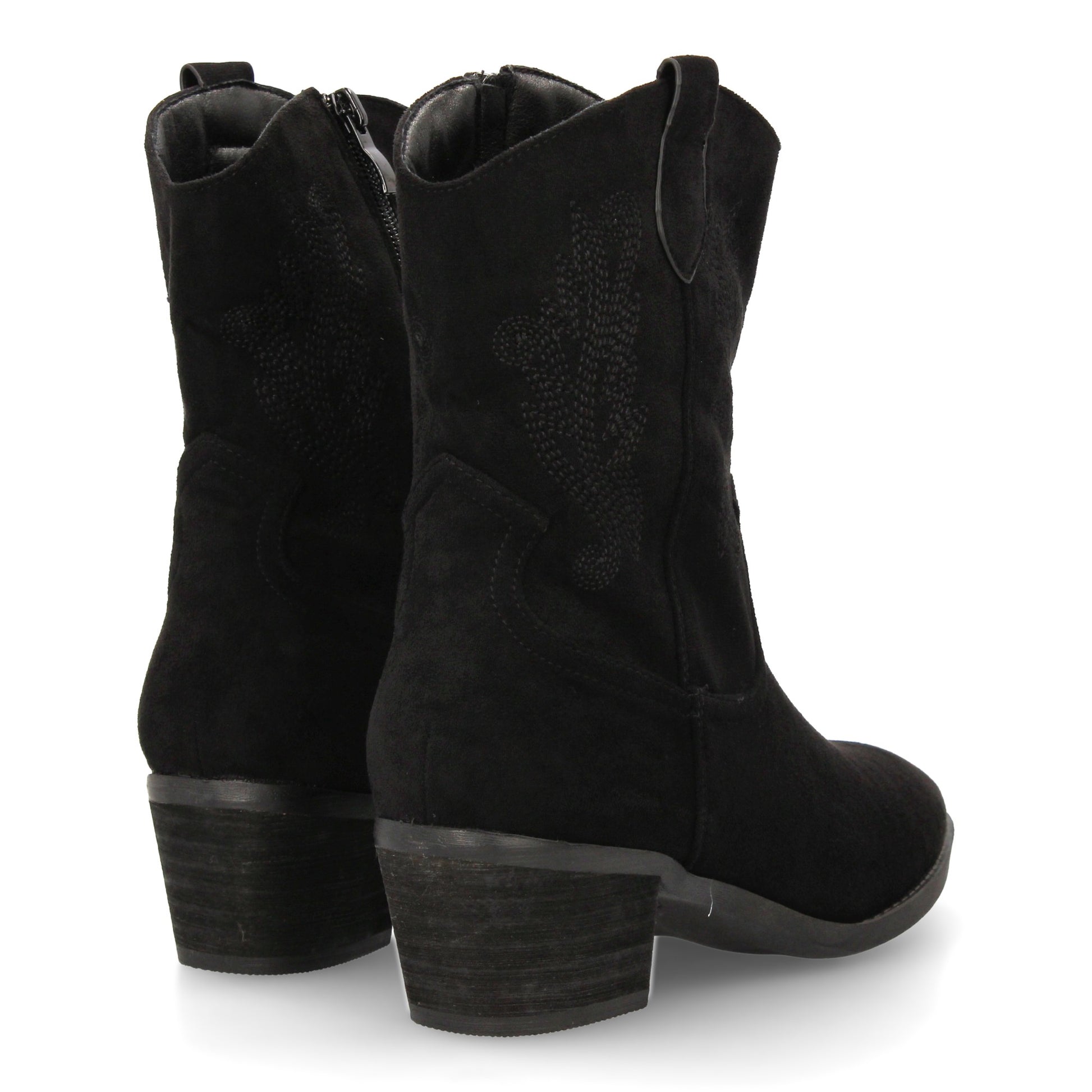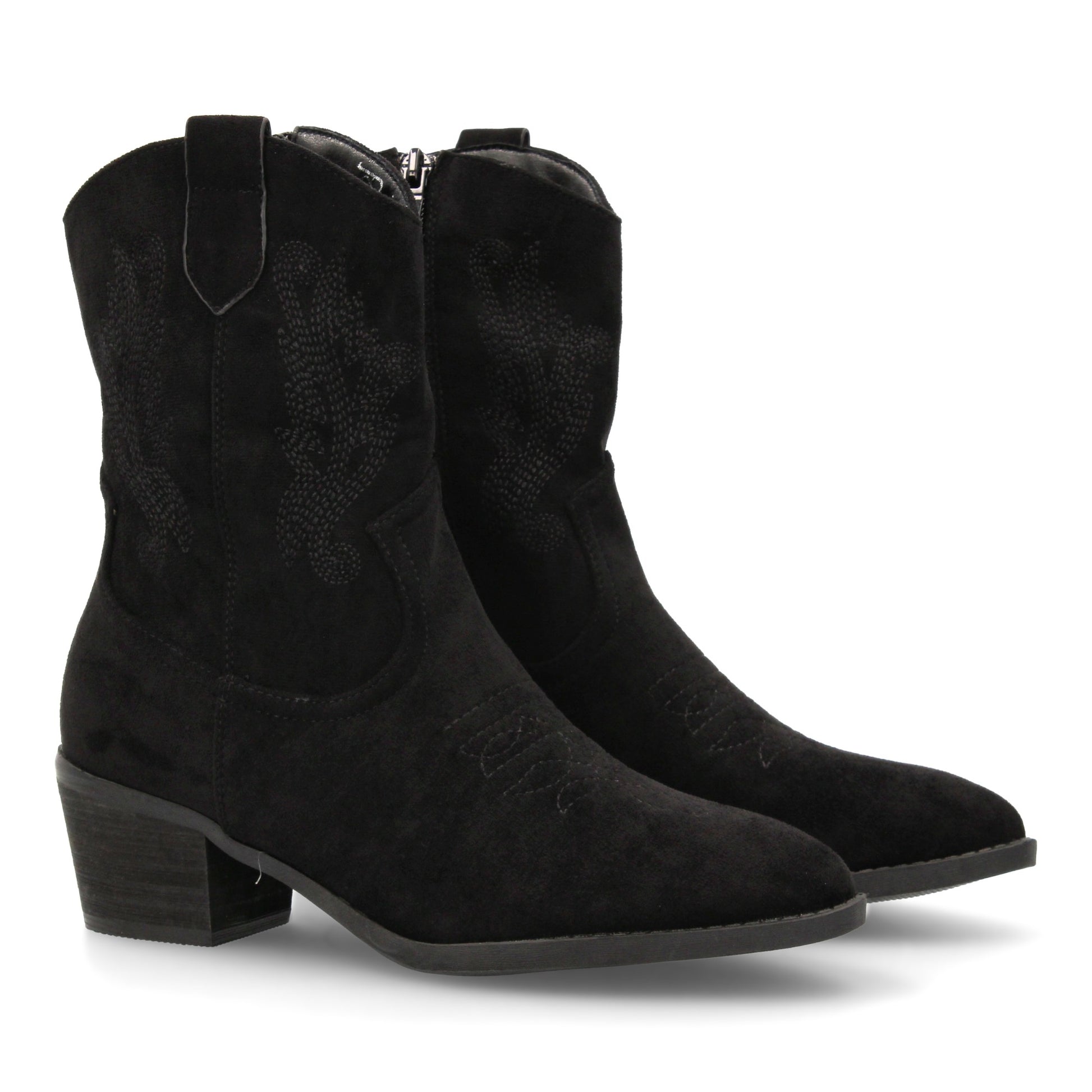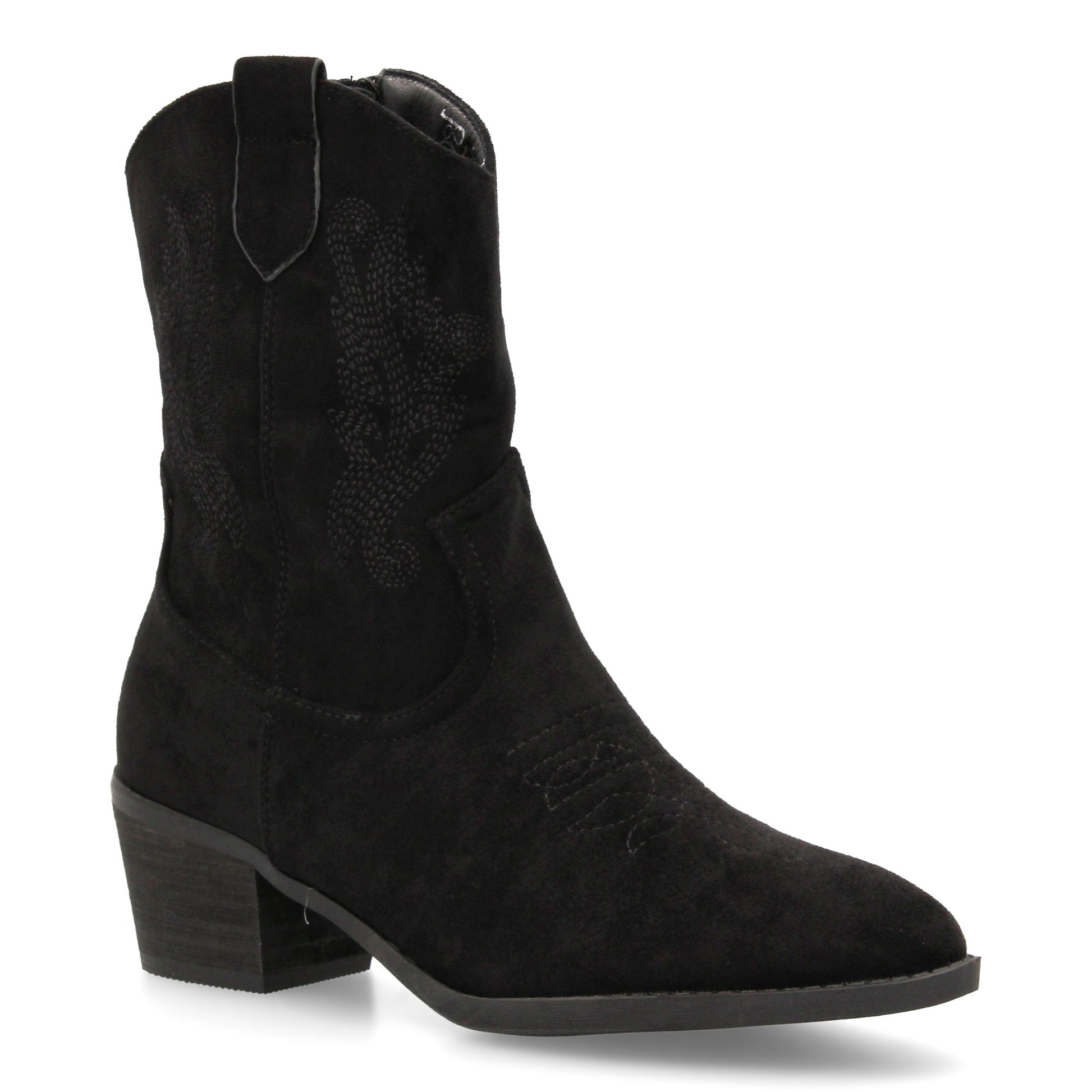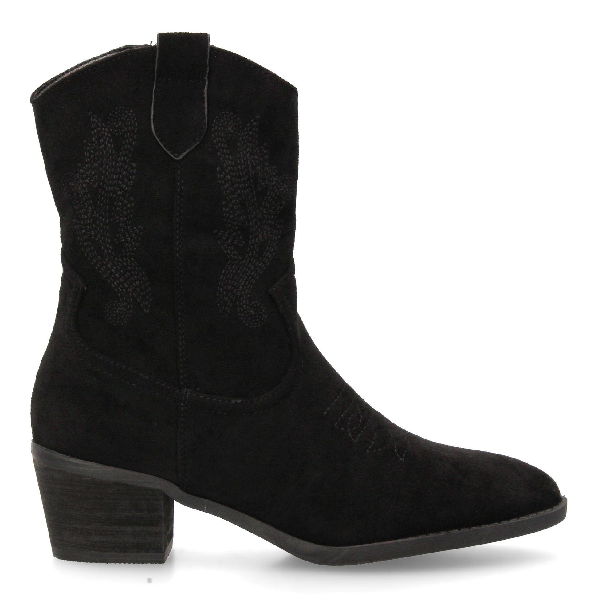 Bota cowboy de caña media con bordados laterales y punta fina. Tacón ancho comodo ideal para mujer en temporada Otoño invierno. Cierre de cremallera.