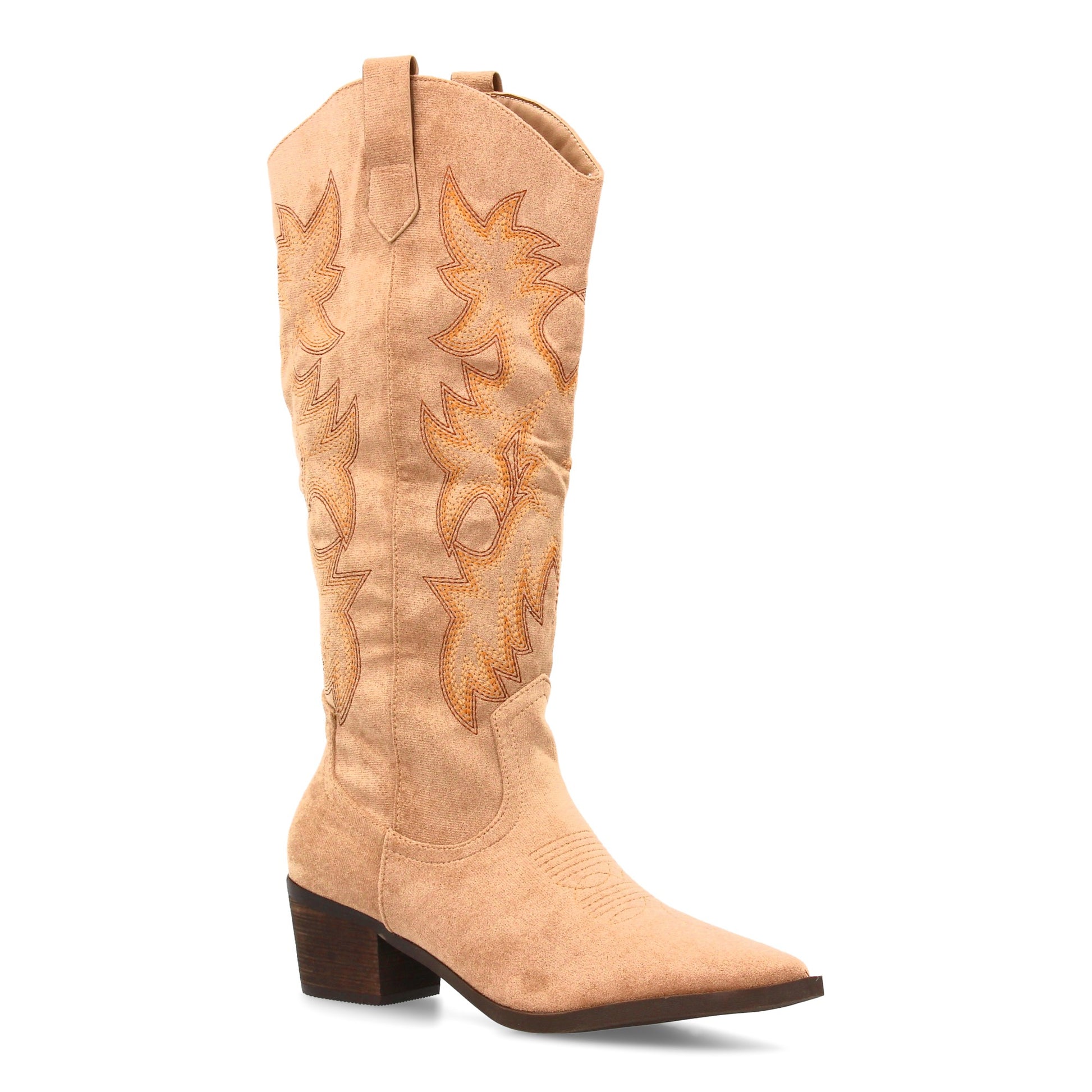 Botas camperas de mujer con caña alta y bordados estilo cowboy cierre de cremallera tacon comodo cubano punta fina. Estampado liso ideal para la temporada otoño invierno