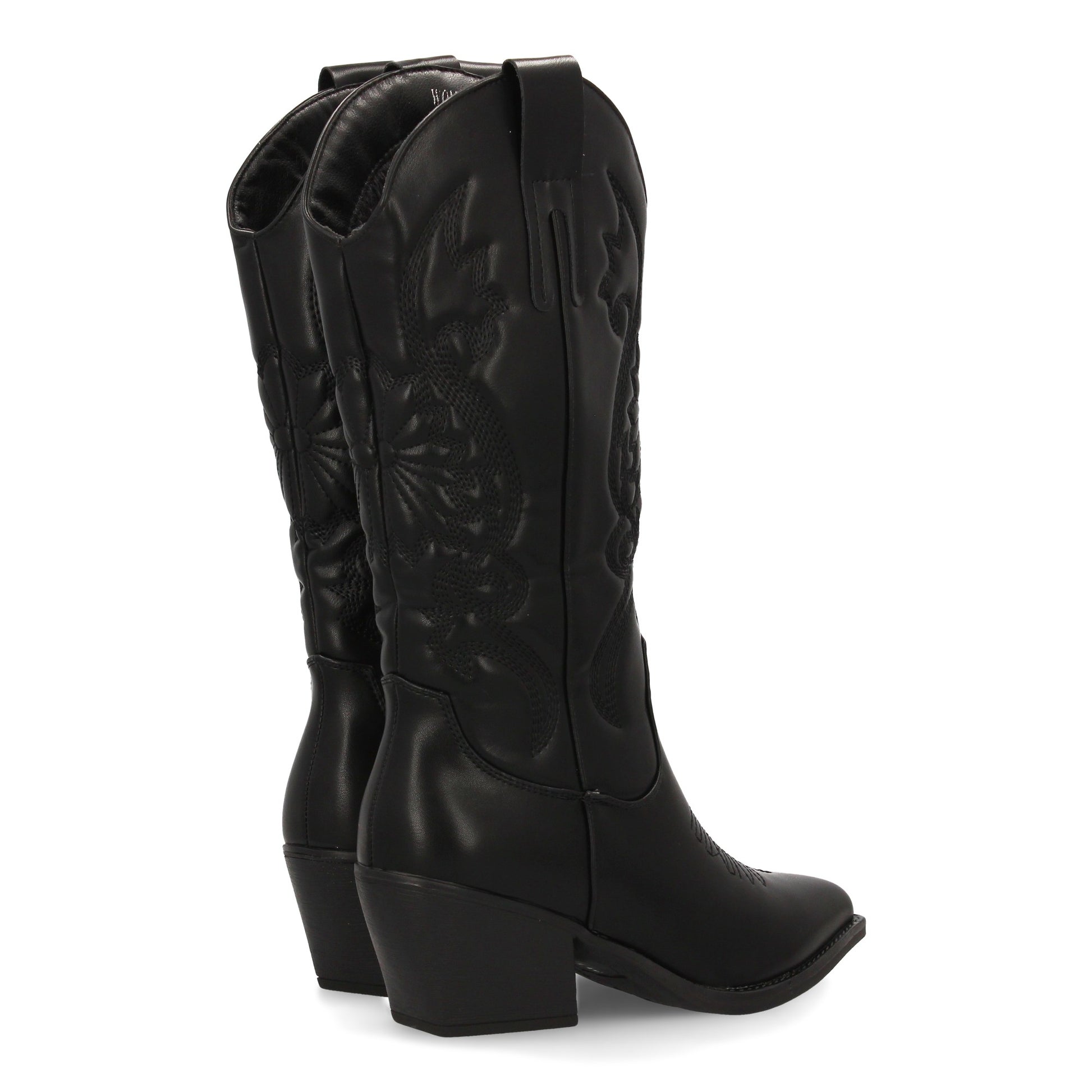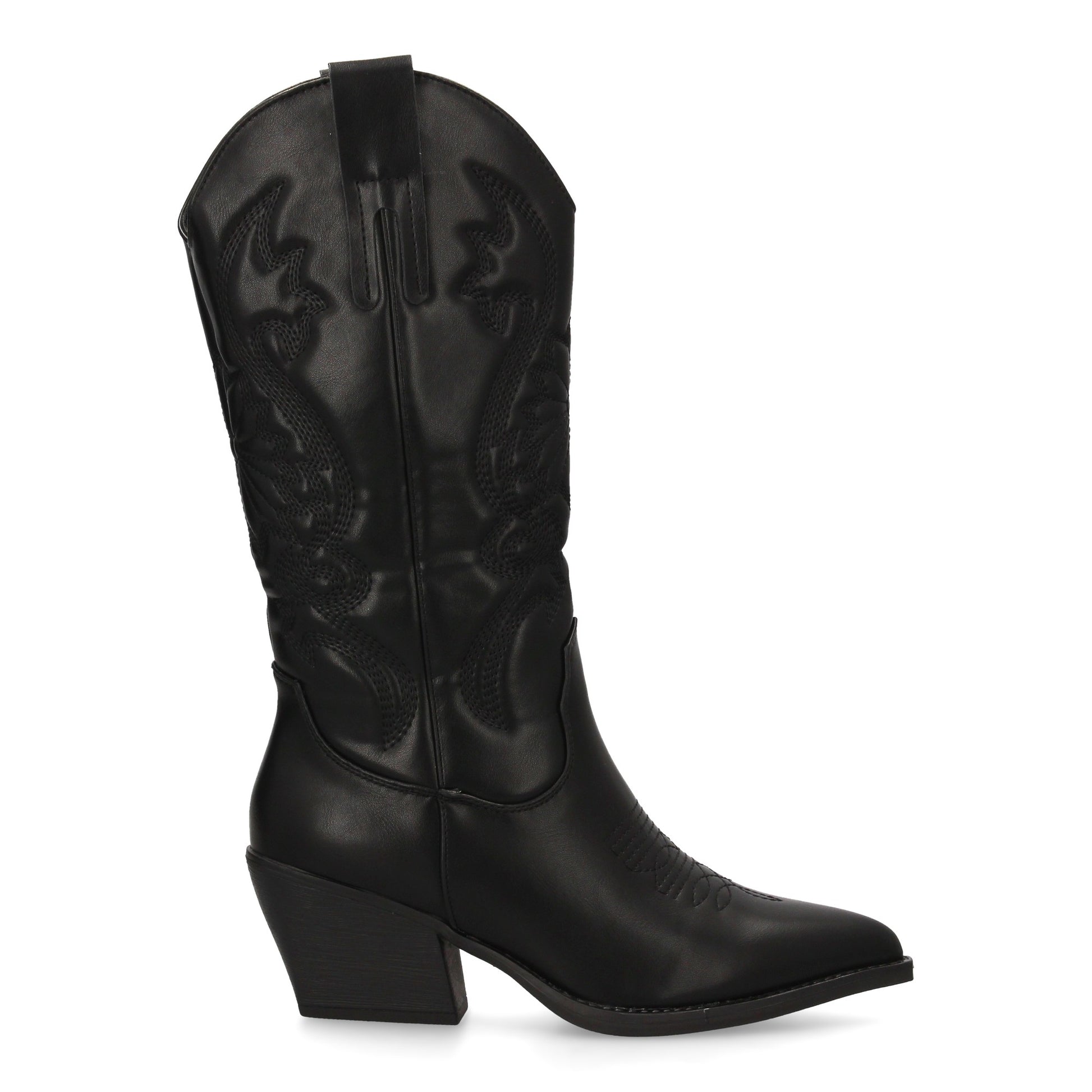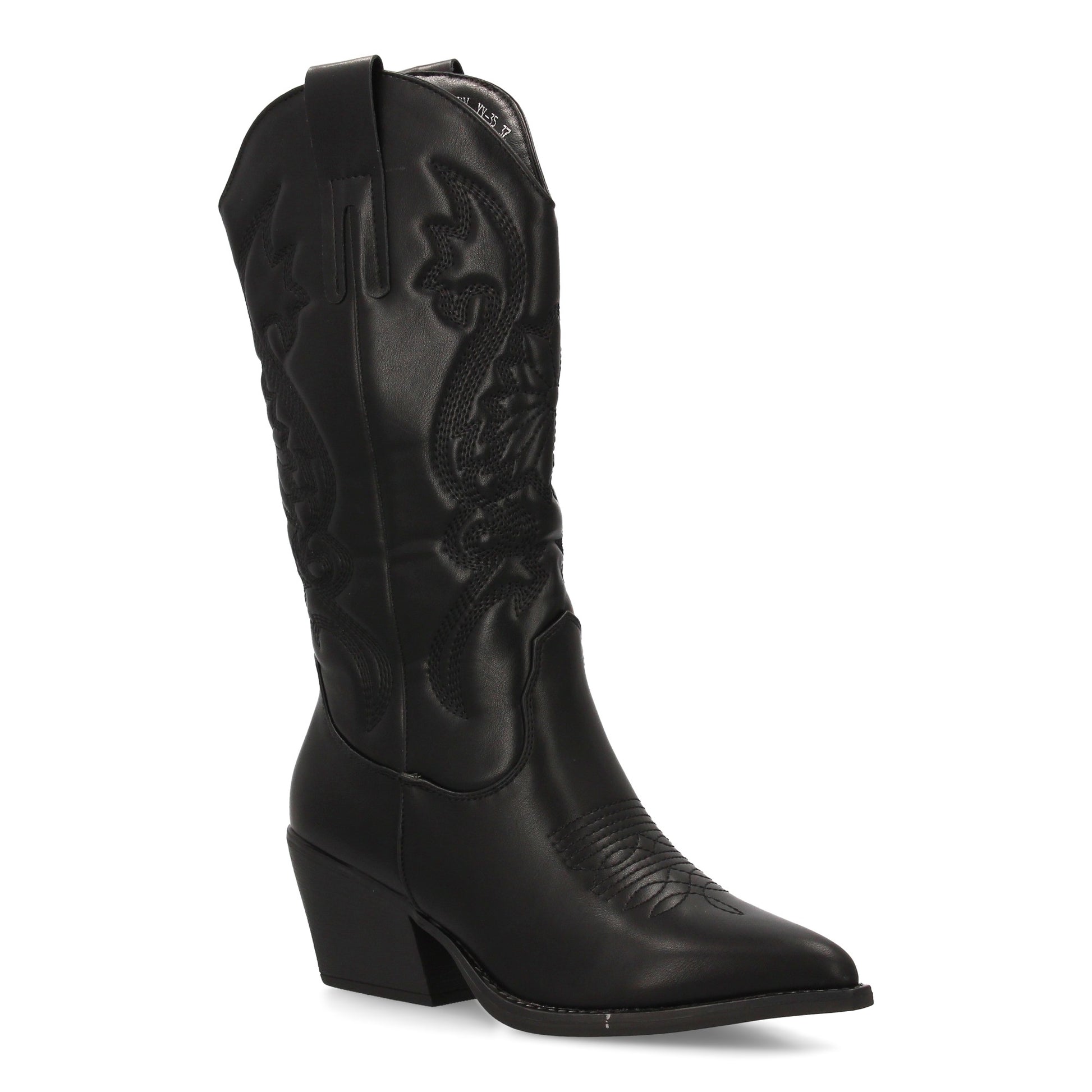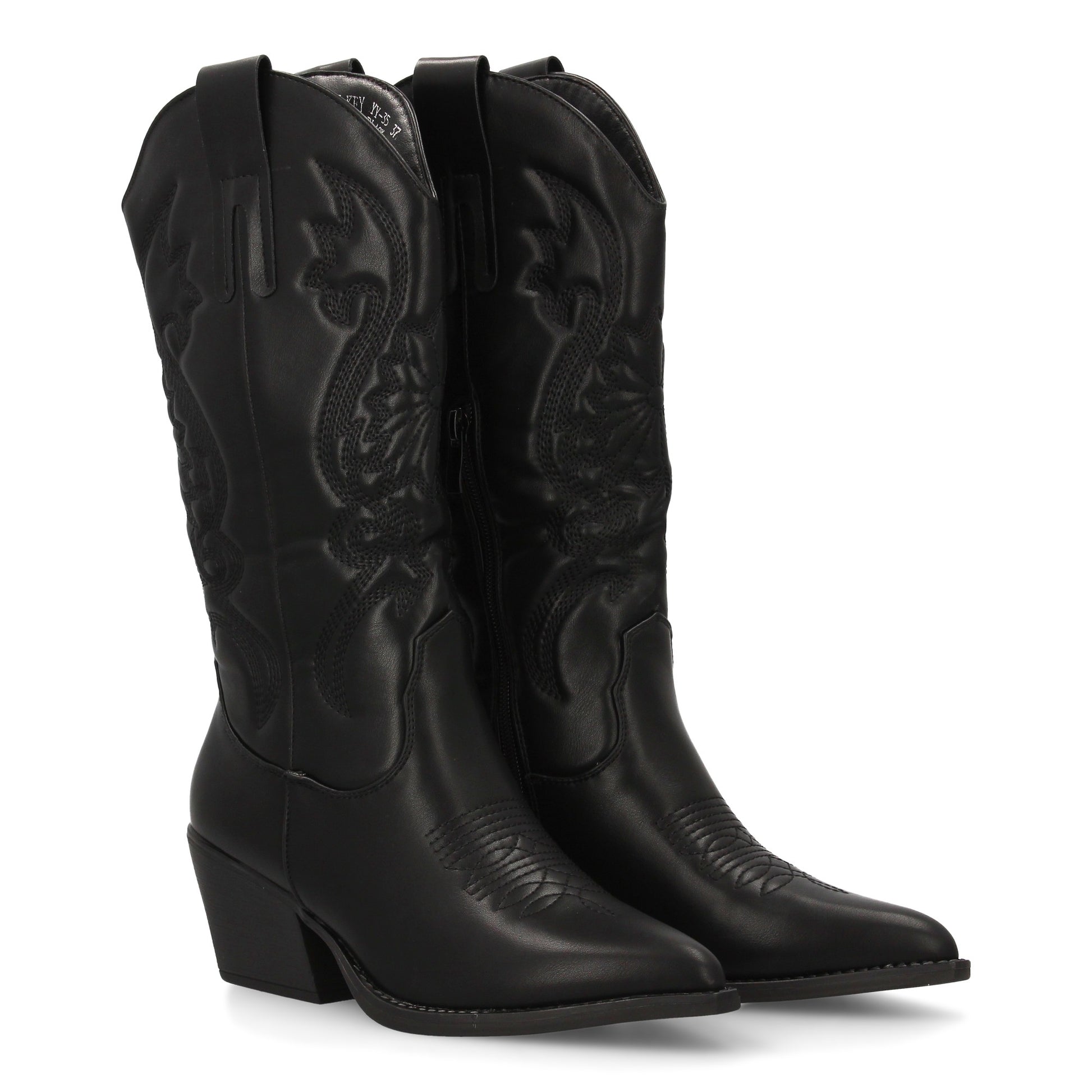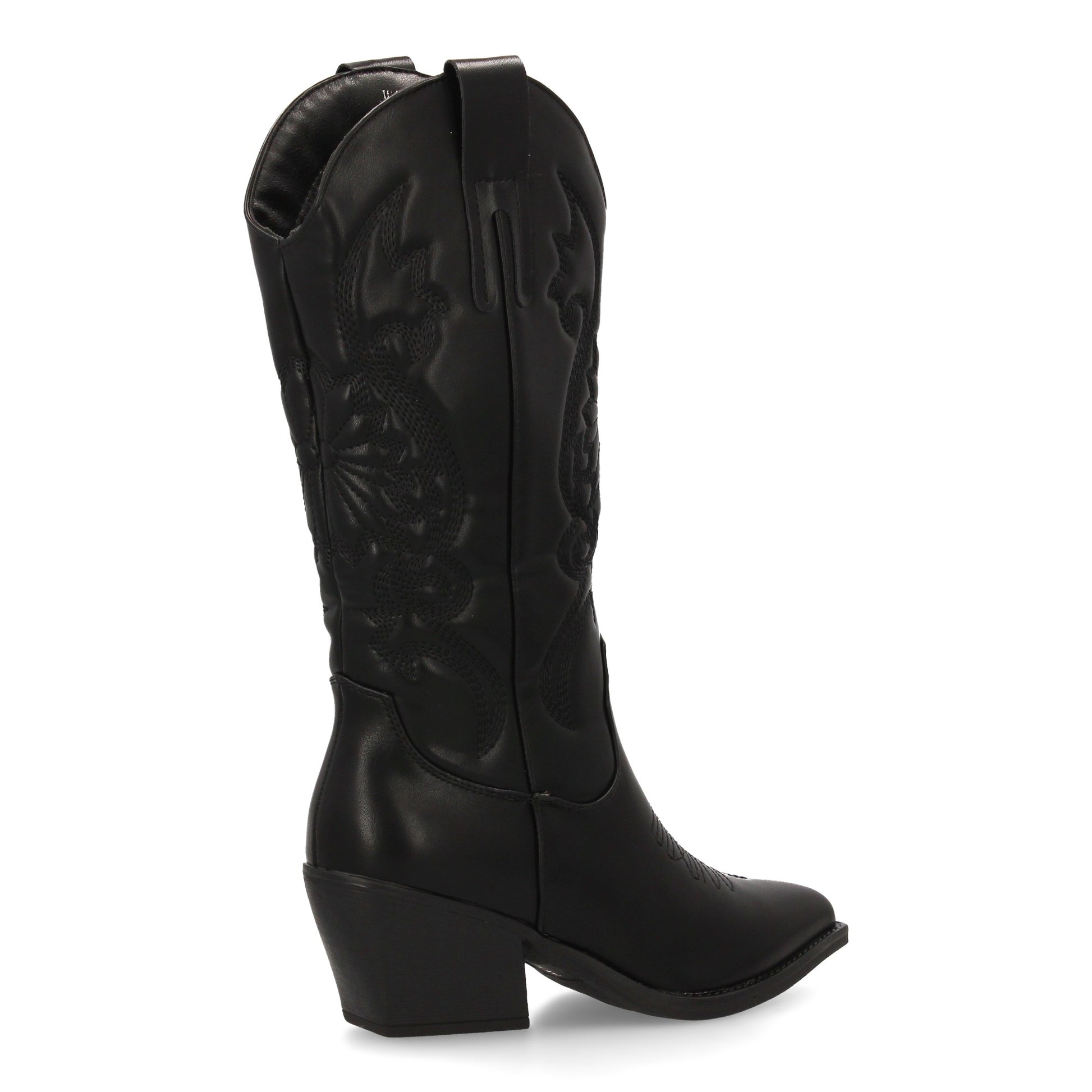 Bota cowboy de caña alta con bordados para mujer. Tacón medio y punta fina estampado liso. Estilo campero y cierre de cremallera ideales para temporada otoño invierno.