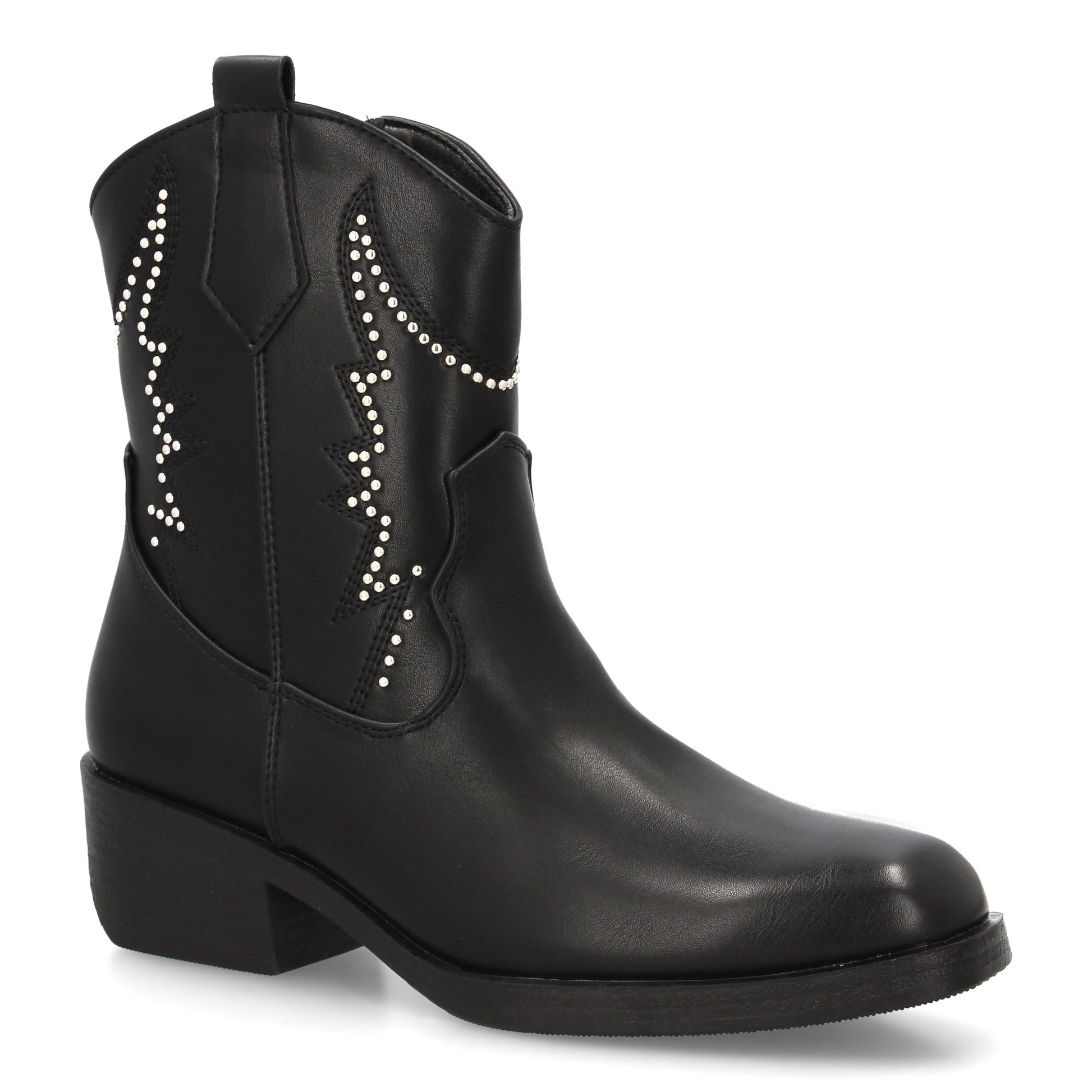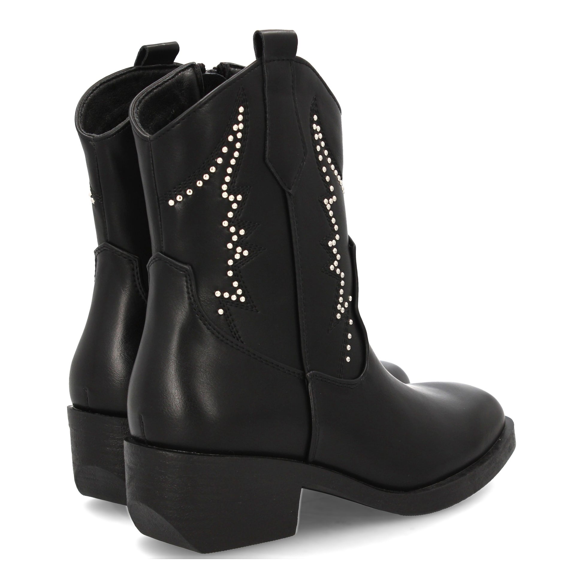 Bota cowboy para mujer con caña media adornada con tachuelas decorativas y costuras en relieve. Tacón ancho cómodo. Cierre de cremallera